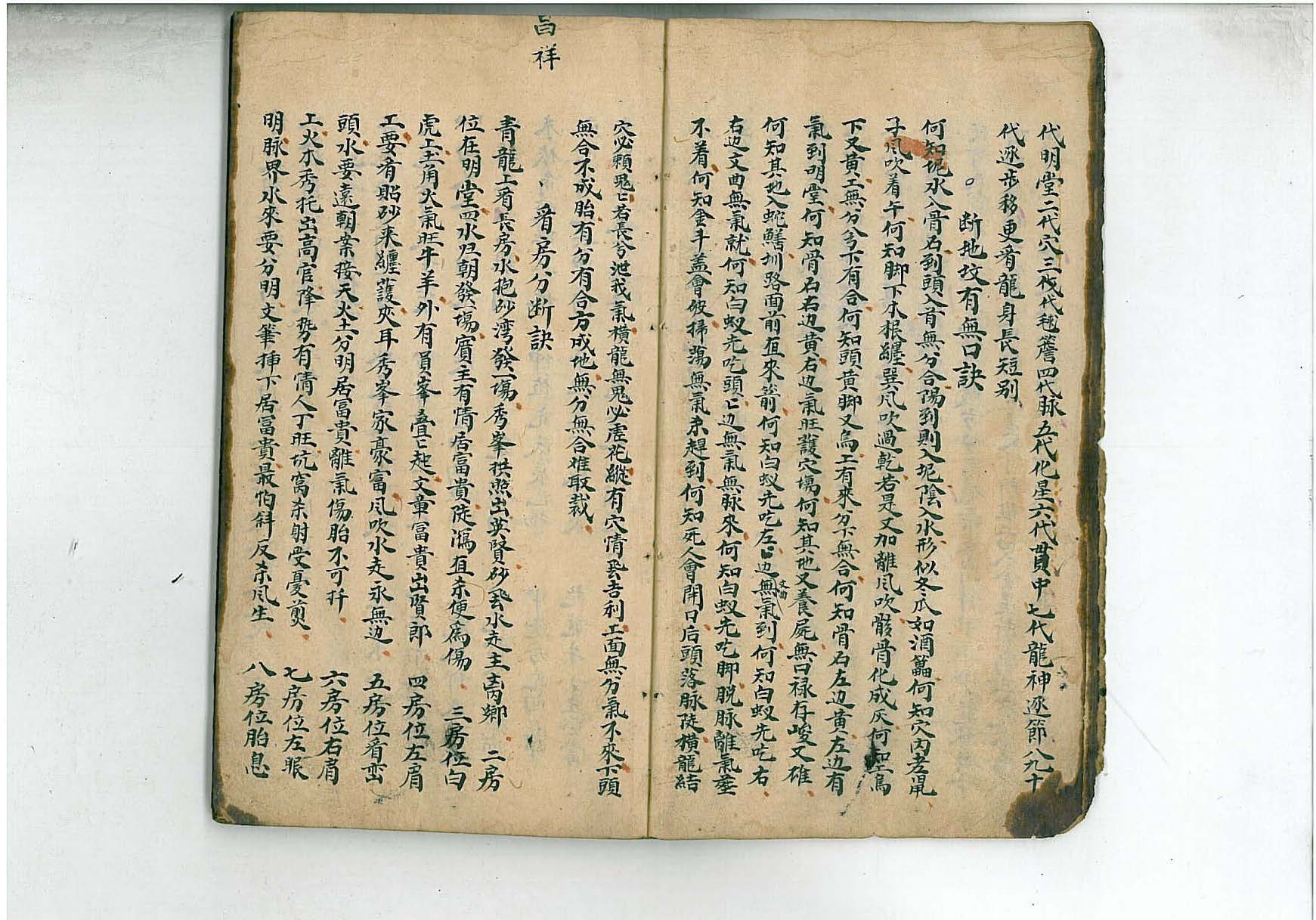 青龙上看长房,水抱砂湾发一场,秀峰拱照出英贤,砂飞水走主离乡,二房位在明堂,四水归朝发一场,宝主有情居富贵,徒泻直杀便为伤,三房位白虎上,土角火气旺牛羊,外有员峰叠叠起,文章富贵出贤郎,四房位左肩上,要有贴砂来缠护,夹耳秀峰家豪富,风吹水走永无边,五房位看峦头,水要远朝案接天,火土分明居富贵,离气伤胎不可扦,六房位右肩上,火木秀托出高官,峰势有情人丁旺,坑窝杀射受忧煎,七房位左眼明,脉界水来要分明,文笔挿下居富贵,最伯斜反杀风生,八房位胎息停,逆水朝来按有情,主秀便高前峰起,惟嫌水散八风吹,九房位右眼明,水火缠护更有情,逆水朝迎居富贵,逢凹向侧主灾生。