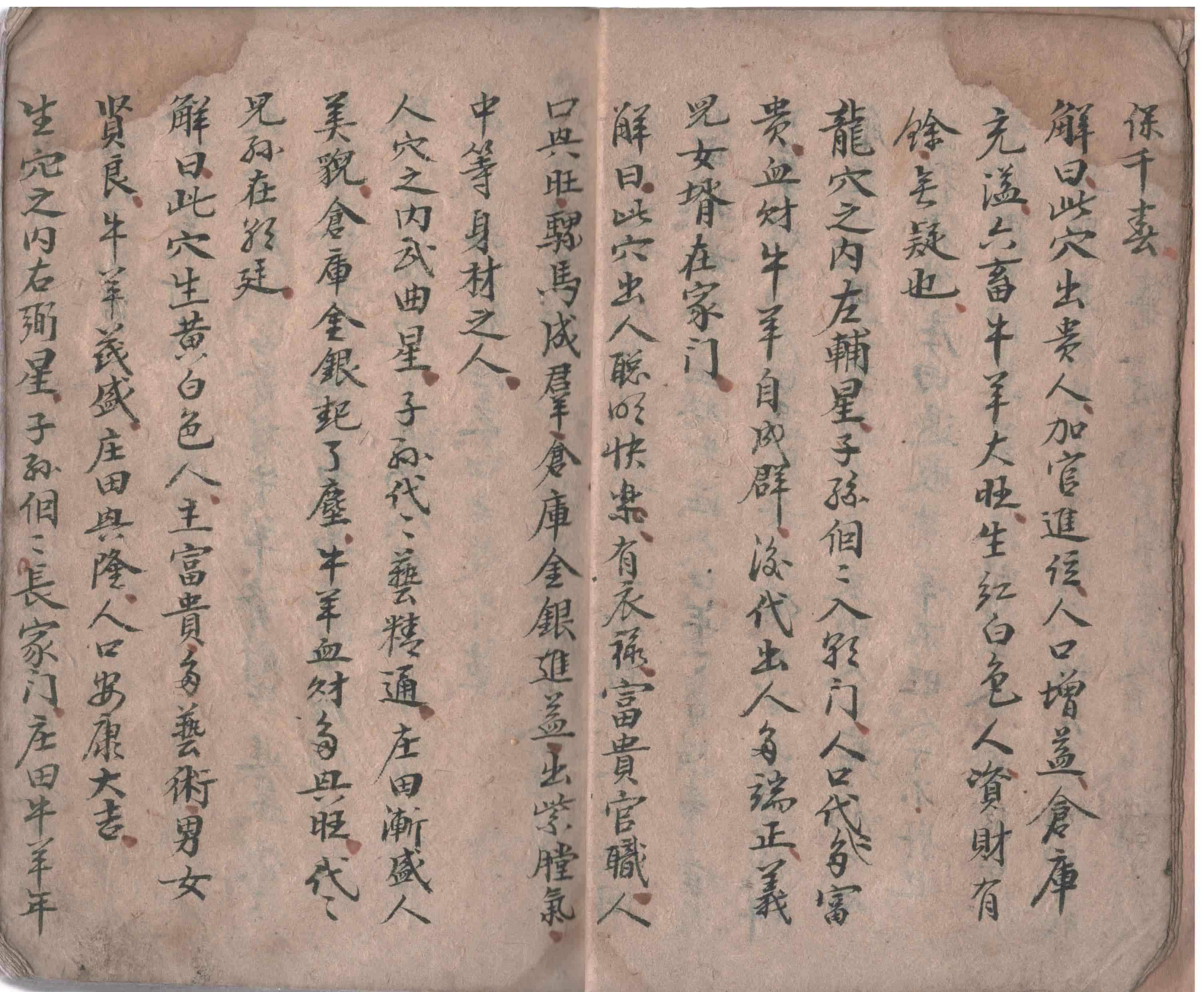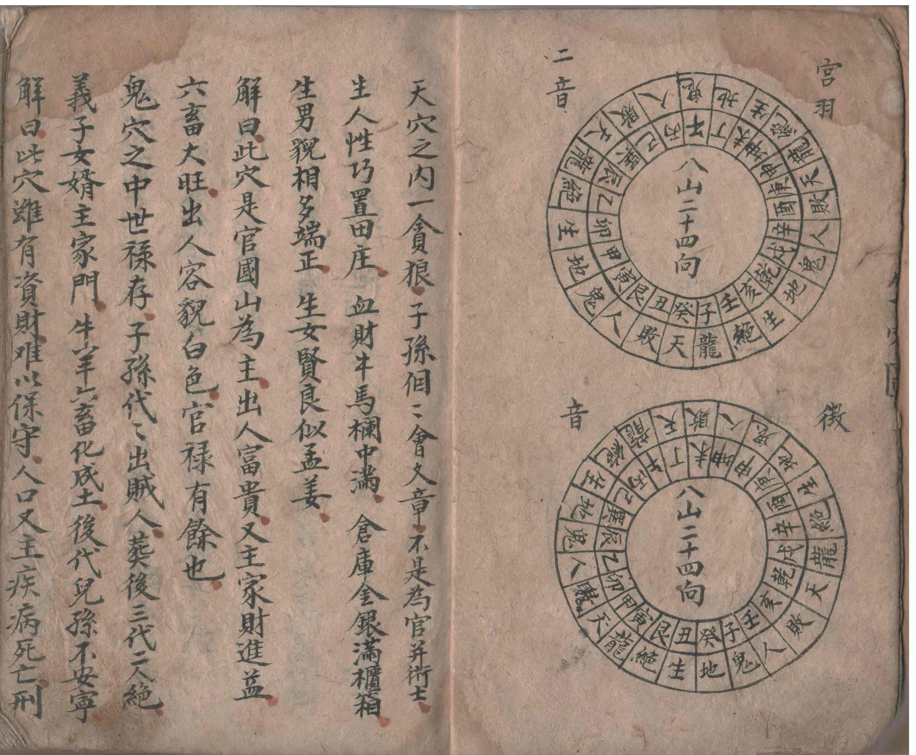 宫羽二音,巽庚癸上起天穴,商音艮丙辛上起天穴,角音坤壬乙上起天穴,徽音乾甲丁上起天穴,天败人鬼地生绝龙,天穴之内一贪狼,子孙个个会文章,不是為官并衍士,生人性巧置田庄,血财牛马栏中满,仓库金银满柜箱,生男貌相多端正,生女贤良似孟姜。解曰,此穴是官国山為主,出人富贵,又主家财进益,六畜大旺,出人容貌白色,官禄有餘也。鬼穴之中世禄存,子孙代代出贼人,葬后三代二人绝,义子女婿主家门,牛羊六畜化成土,后代儿孙不安寕,解曰,此穴虽有资财,难以保守,人口又主疾病死亡,刑伤,退败庄田。。。