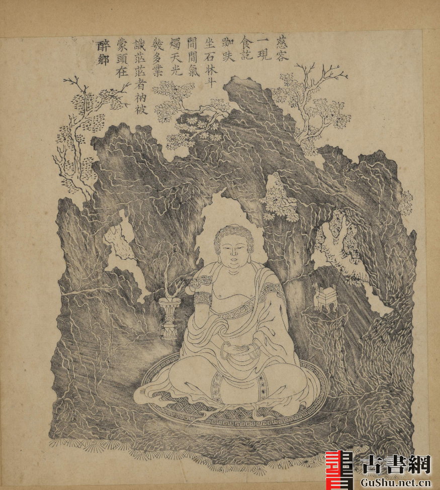 此《观世音菩萨慈容五十三现》画册绘者未知。其中描绘了普陀梵音洞大士示相五十三种(多为女相,并融入善财童子),前附护法韦陀一幅,每幅附赞诗。此本大致为清康熙时期山阴戴王瀛滋德堂刊本,绘刻精工,线条流畅。