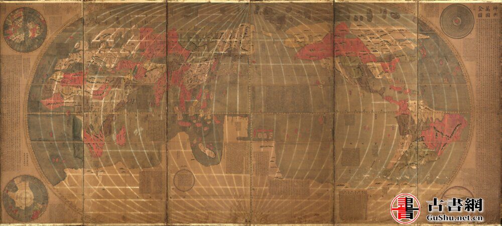 此《坤舆万国全图》由意大利传教士利玛窦与李之藻合作而成。全图共六幅条屏,其内容大致分作三部分:主图是椭圆形的世界地图、四个角的天文图和地理图以及题跋解释说明的文字。这是中国第一幅完整的经纬世界地图。此内含明万历三十年原刻本,朝鲜、日本后摹本共六幅。
