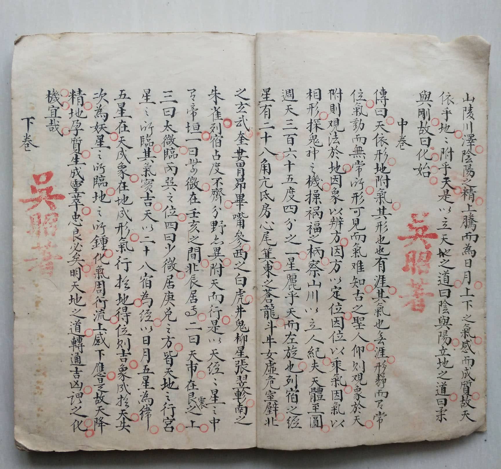 传曰,天依形,地附气,象其形也也有涯,其气也也无涯,形静而常位,气动而无常所,形可见而气难知,古之圣人,仰则观象於天,附则观法於地,因象以辨方,因方以定位,因位以乘气,因气以相形,探鬼神之机,操祸福之柄,察山川以立人纪,夫天体至圆,週天三百六十五度四分之一,星丽乎天而左旋也,列宿之经星有二十八,角亢氐房心尾箕,东之苍龙,斗牛女虚危室壁,北之玄武,奎娄胃昂毕嘴参,西之白虎,井鬼柳星张翌軫,南之朱雀,列宿占度不齐,分野六异,附天而行,是以天经经星之中帝垣,一曰业微,在壬亥之间,北辰居,二曰天市,在艮震之上,三曰太微,临丙巽之位,四曰少微,居庚兑之方,皆天地之行宫,星之所临,其气实吉,天以二十八宿為经,以日月五星為纬,五星在天成象,在地成形,气行拾地,得位则吉,象成拾天,失次為妖,星之所临,地之所钟,化气周行流,上感下应,是故天降精,地孕质,生成空萃,忠良必矣,明天地之道,转通吉凶,谓之化机宜哉。