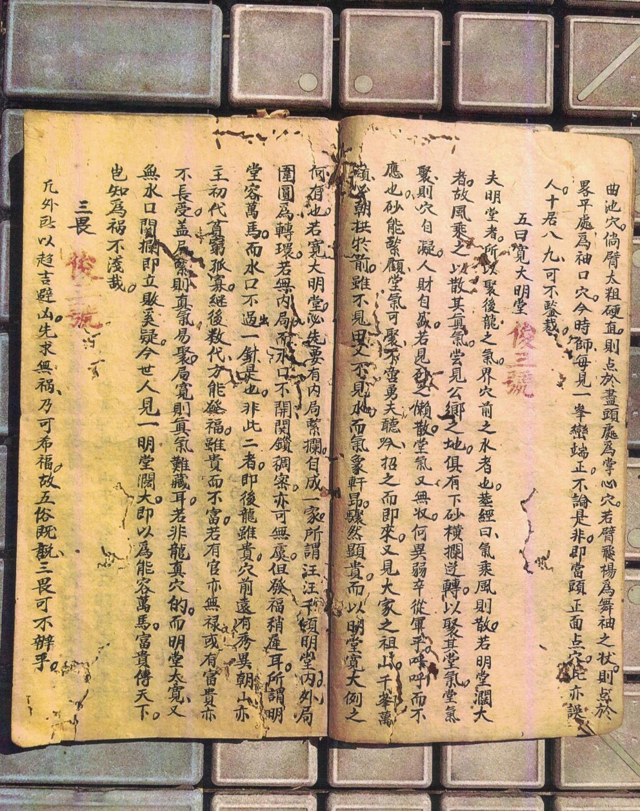 余初年看地,只在两水合襟处,极力搜寻,务期必得。以为当然不易者,多览古坟,遍历山川情意,乃知大谬不然,徃徃自见合水在前,则山嘴必尖,水流必直,龙虎必长,眞气荡然,无一可者。惟有合於转右出,必得右砂稍关,又合於右转左出,亦得左砂稍闌,庶几可以,裁穴。世人若不论龙穴结作,止以水口合襟为奇,则送龙枝脚三条五条,亦有合襟者,但行龙挠掉三节五节亦有合襟者,岂皆可作穴乎。又有一等大龙结作,乃在群山辐輳之中,登山只见峰峦簇簇,分毫不见田水,此岂可以合襟论乎。古人曰,也有龙好无水朝,则把案山為近侍,案外一水暗循环,此穴断非中下地。又曰,两水合处莫当中,流水倾泻最为凶,番身逆转朝来脉,发福绵绵为坐空。又曰,两水合处莫当面,不在左边在右边,仙人倒杖宜横下,下手虽宽也进田,夫坐空与下手空,堪舆所忌,但合水直行,宁可倒杖横扦,而不以为嫌,故以钳口合水之说,為风水大惑也,非数十年不能酒脱,非髙人指示不能省觉,学者勿障於此迷途也。
