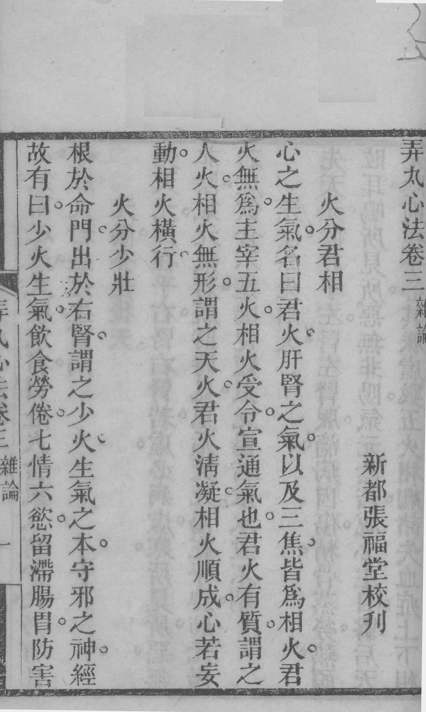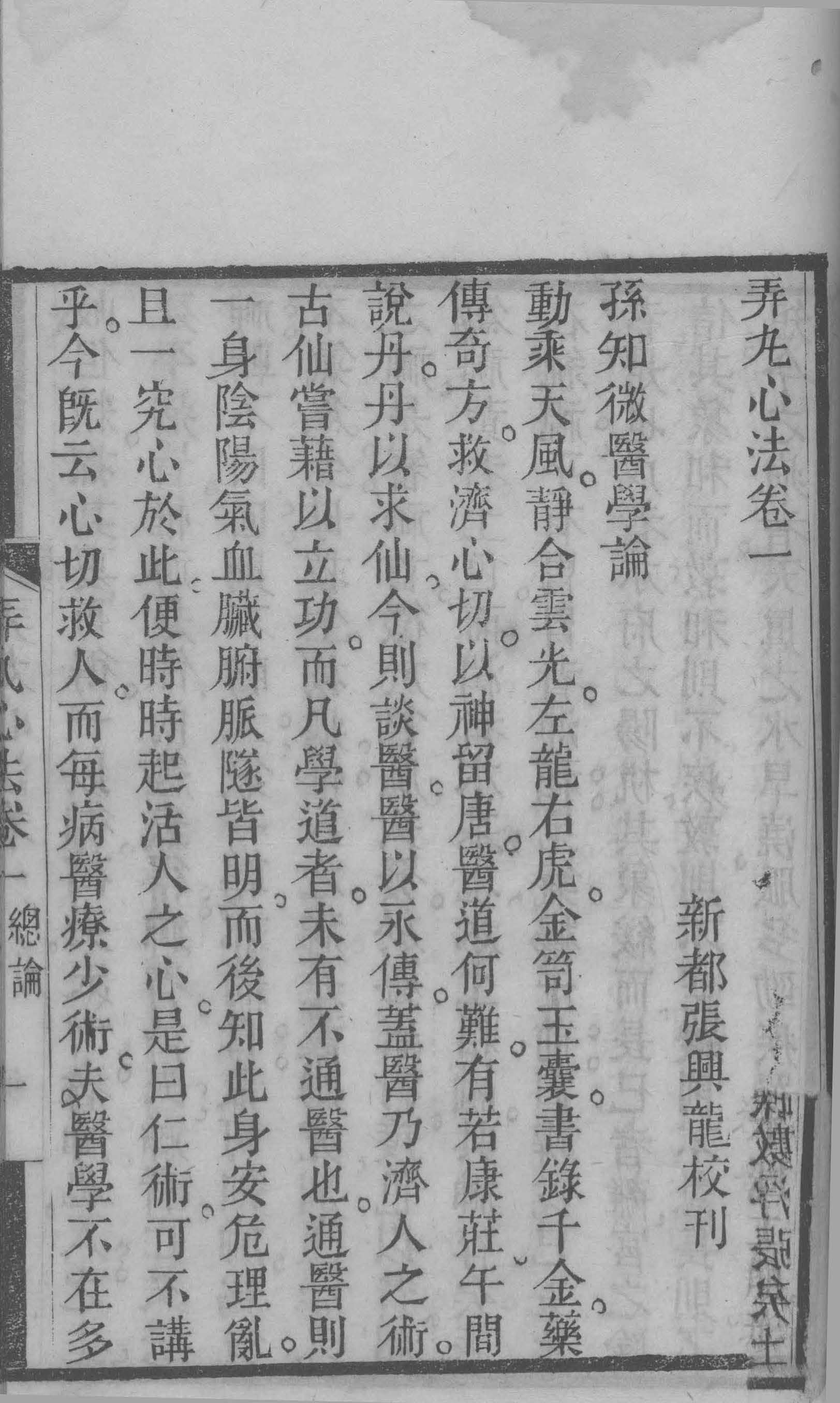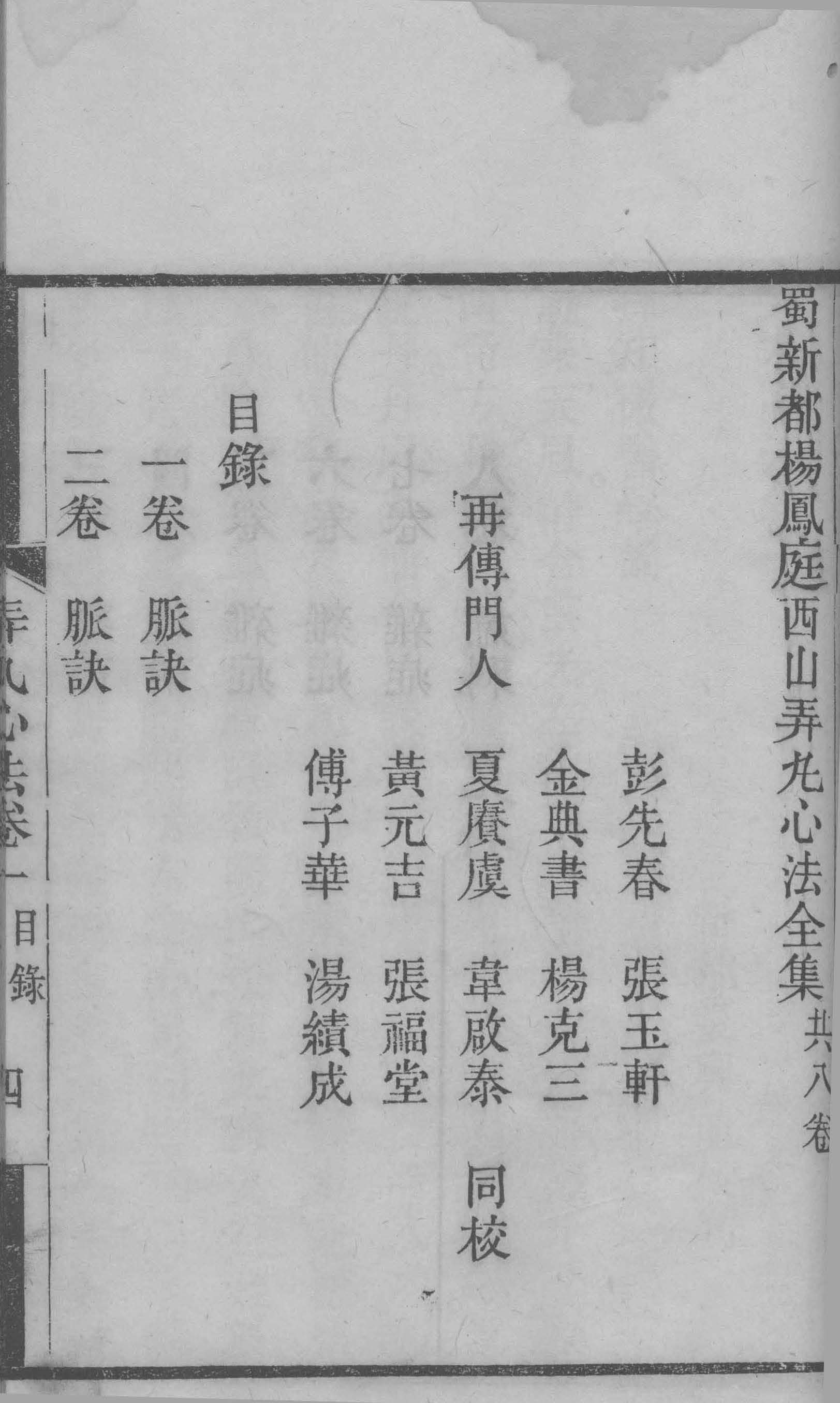 物有经兵燹烽火,几历沧桑,而终必传者,精神所到,鬼神為之阿护,故其光愈幽愈厚,而一发即不可灭,证之西山先生弄心法一书益信,先生乾隆间人,隶籍新都,姓杨氏,名凤庭,西山其字也,幼聪颖,及冠,通经史,博极群书,於岐黄家尤多心得,当时议者咸以公辅期之,惜领乡荐后,屡举进士不第,先生遂绝意功名,盖谓不為良相,当為良医,乃专治於内难二经,及仲景伤寒金匮,下迄有唐千金外台,宋元诸名家等书,鸣呼,先生之心苦矣,而医之一道,亦由苦生愤,由愤生专,专以极而熟,於是察天地之变,审阴阳之情,考运会之迁流,究风气之趋向,一一合之於七情六淫,然后望其色,闻其声,问其因,乃归宿於切脉,以辨症立方用药,如石之投水,如矢之赴的,下无不入也,发无不中也,而其医於是大成,而即医以所著之书,亦於是可久,然则先生之书,胡不传於及身,何以必俟二百年后,始传乎,曰,是即所谓可久者也,盖天下事有传於彼,不传於此者,有传於后,不传於先者,适為之也,先生当遯世负名之日,其道固已大光,而及门弟子,类若各具一体以竞雄,故於先生之书,彼得一节焉,或扄之以為秘珍,此得一节焉,或藏之以為鸿宝吁,此重先生而不知所以重先生也,流传既久,零落就萎,有心人起而收拾之,又苦才力不逮,强為牵合,有移彼就此,及取他人之书,与杂以己意,而补缀其中者,今全书具在,一披阅之,而后知其然也,然终不以此為先生病也,先生有独到之处,决不使作伪乱真,更不使强客夺主,耿耿元精,能读先生书者,终能为先生辨之,至其文义语气,间有复杂不贯诸病,知为修集者所误,更能为先生谅焉,今有先生再传门人,张福堂诸君,有鉴於此,以是书不刻,恐再逾若干年,其紊乱又不知凡几,因以此意索序於余,余闻之喜曰,先生傅矣得此而庐山真面,终存於烟云障翳中,而翘然千古,后之继斯而有志者,茍能去其芜秽,载其精华,俾先生书為完善书,则福堂今日之举,又未必非后之嚆矢也哉。