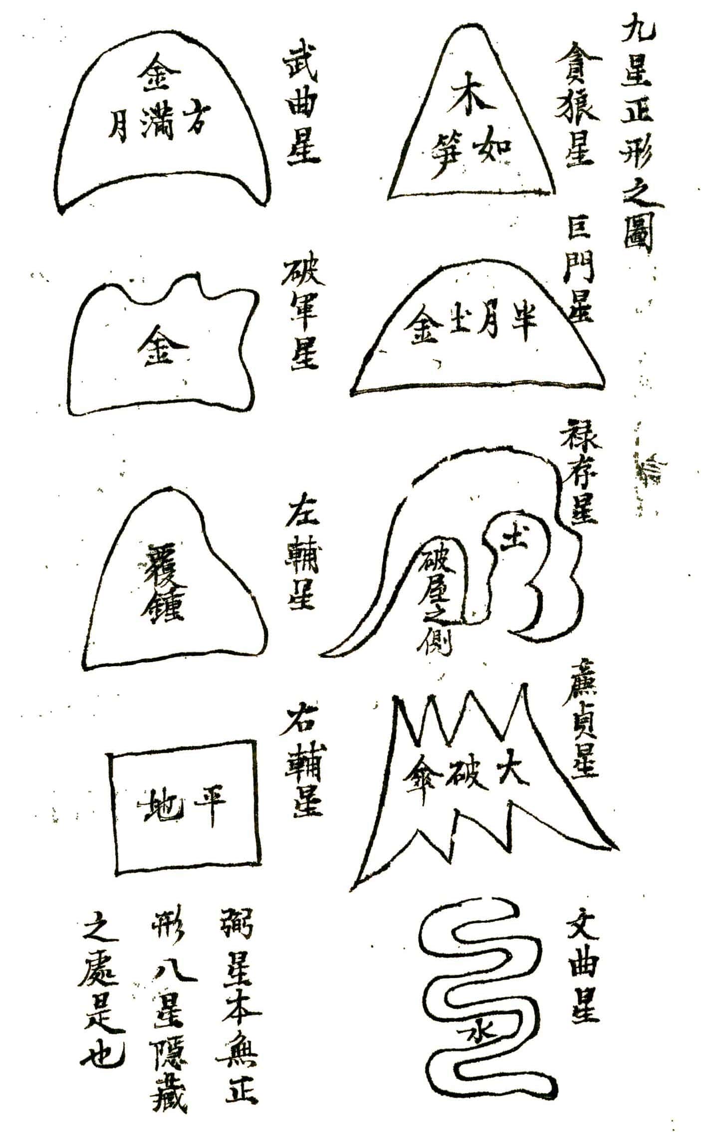 正变歌正变歌,九星正变何其多,姑幕正形為次第,略排图例正蒙讹,变形触类由人举,心自聪明事不难,太阳正体覆钟似,太阴新月半光辉,金水両肩似飞凤,紫炁貟直笏囊垂,天财正躰如屏笏,凹脑双脑如官誥,燥火尖刀样最凶,扫荡曳帛展旗同,天罡张盖形相并,孤曜饱直如覆磬,次名开口三悬乳,四是弓脚五双臂,单股第六侧脑七,八為没骨平面毕,此号九星逓变名,每星九九変其形,只是脚变头不变,活泼心中应变成,吾今宜切传程子,為念孤贫兴奋情,阴阳造化神鬼秘,寡德之家莫乱鸣,轻将此术沽财酒,丧行招殃自不轻。