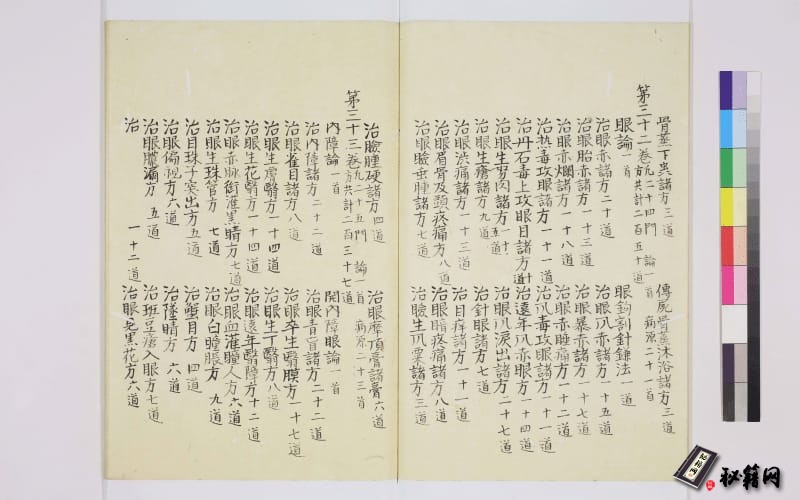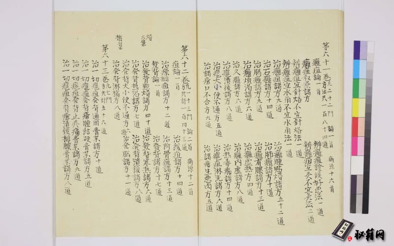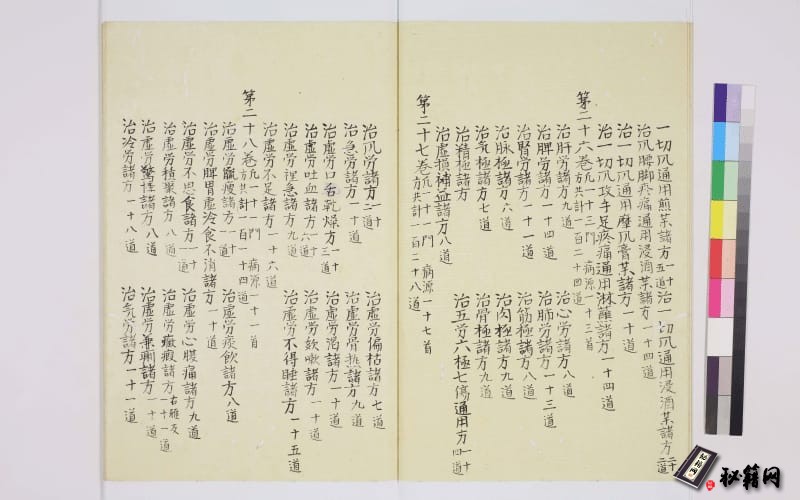 卷十九至卷九十三按临证各科分列病证治方,主要有中风、虚劳、骨蒸、诸痛、脚气、咳嗽、痰饮、霍乱、积聚、消渴、水病、黄病、诸虫、诸淋、痢疾、五痔、痈疽、瘰疬、伤折、金疮,以及妇人、小儿、五官等病证;