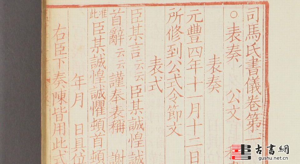 旧时士大夫私家关于书札体式﹑典礼仪注的著作,通名书仪。此本《司马氏书仪》便是北宋著名文人司马光的关于家庭礼仪的著作。此本为同治7年(1868年)江苏书局的朱红色仿宋刊本。