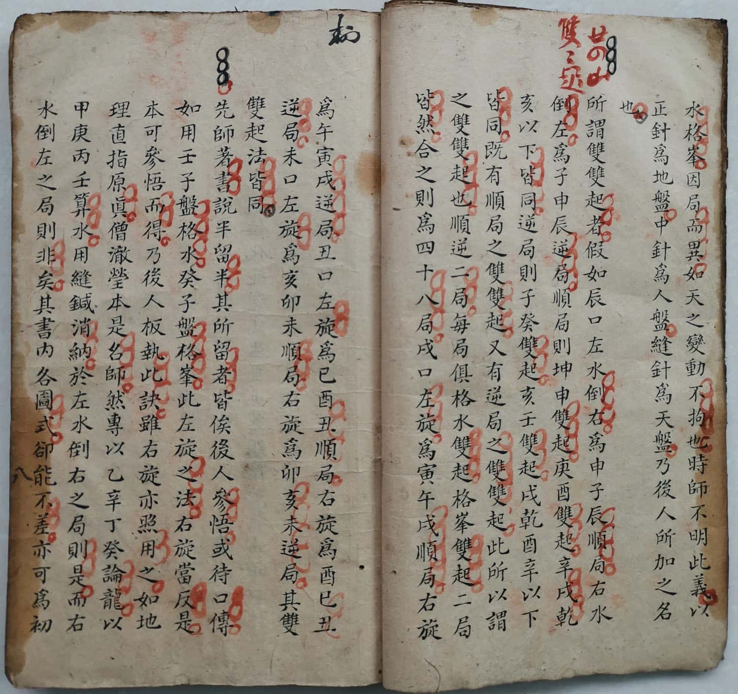 所谓双双起者,假如辰口左水倒右為申子辰顺局,右水倒左為子申辰逆局,顺局则坤申双起庚酉双起,辛戌乾亥以下皆同,逆局则子癸双起亥壬双起戌乾酉辛以下皆同,既有顺局之双双起,又有逆局之双双起,此所以谓之双双起也,顺逆二局,每局俱格水双起,格峰双起,二局皆然,合之则为四十八局,戌口左旋為寅午戌顺局,右旋为午寅戌逆局,丑口左旋为已酉丑顺局,右旋為酉巳丑逆局,未口左旋,為亥卯未顺局,右旋為卯亥未逆局,其双双起法皆同。