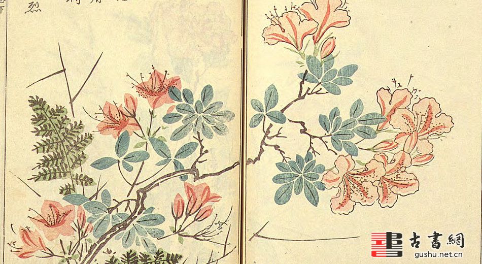 1746年刊印《明朝紫砚》大岡春ト编,又名《明朝生动画园》是日本最早的彩色画谱,现存上中两册,这套画集参考了中国的《芥子园画谱》。此版刻有明文徵明、东郭、孙克弘、戴文进、丁玉川、 朱铨、文衡、王维烈等画五十九图。1813年京都菱屋孫兵衛购买了木刻板添加了部分内容,以三卷三册重新刊印出版。新的版本去除原版画上的印章。