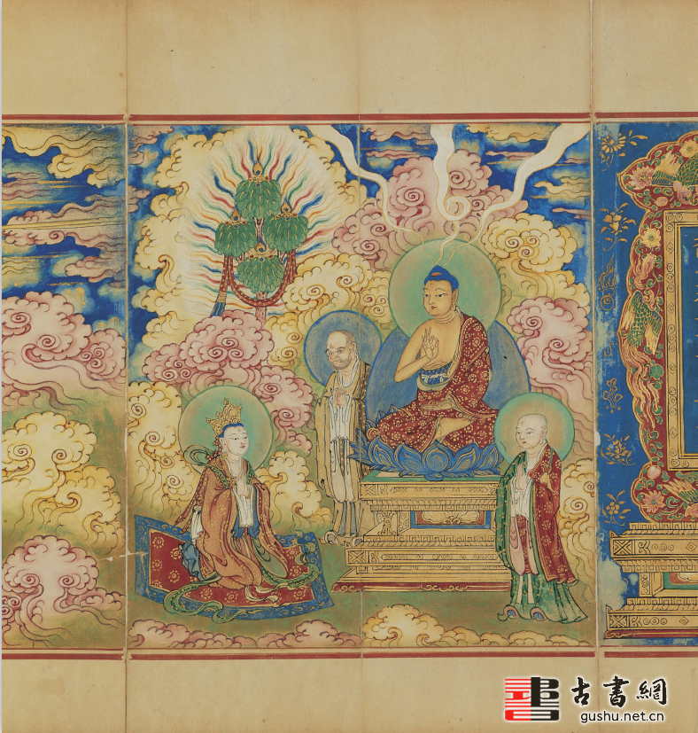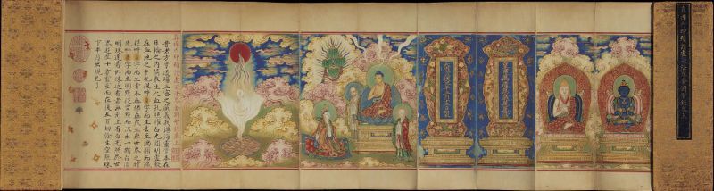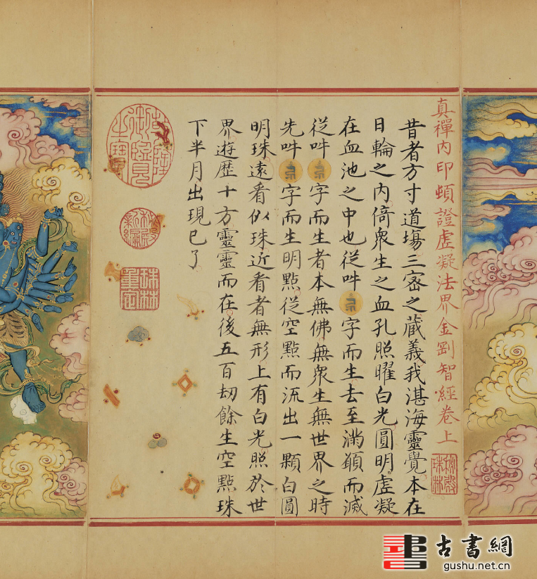 古籍.真禅内印顿证虚凝法界金刚智经.三卷.明.沈度写.商喜绘.台北故宫博物院藏.明宣德三年经折装写本此《真禅内印顿证虚凝法界金刚智经》是明朝撰著的佛典,兼摄晚期密教、三教合一思想与道教箓法,义理极为丰富。全经凡三卷,由明代沈度写,商喜绘图,书内附图一百零三幅。此为明宣德三年彩绘经折装本,现藏于台北故宫博物院。