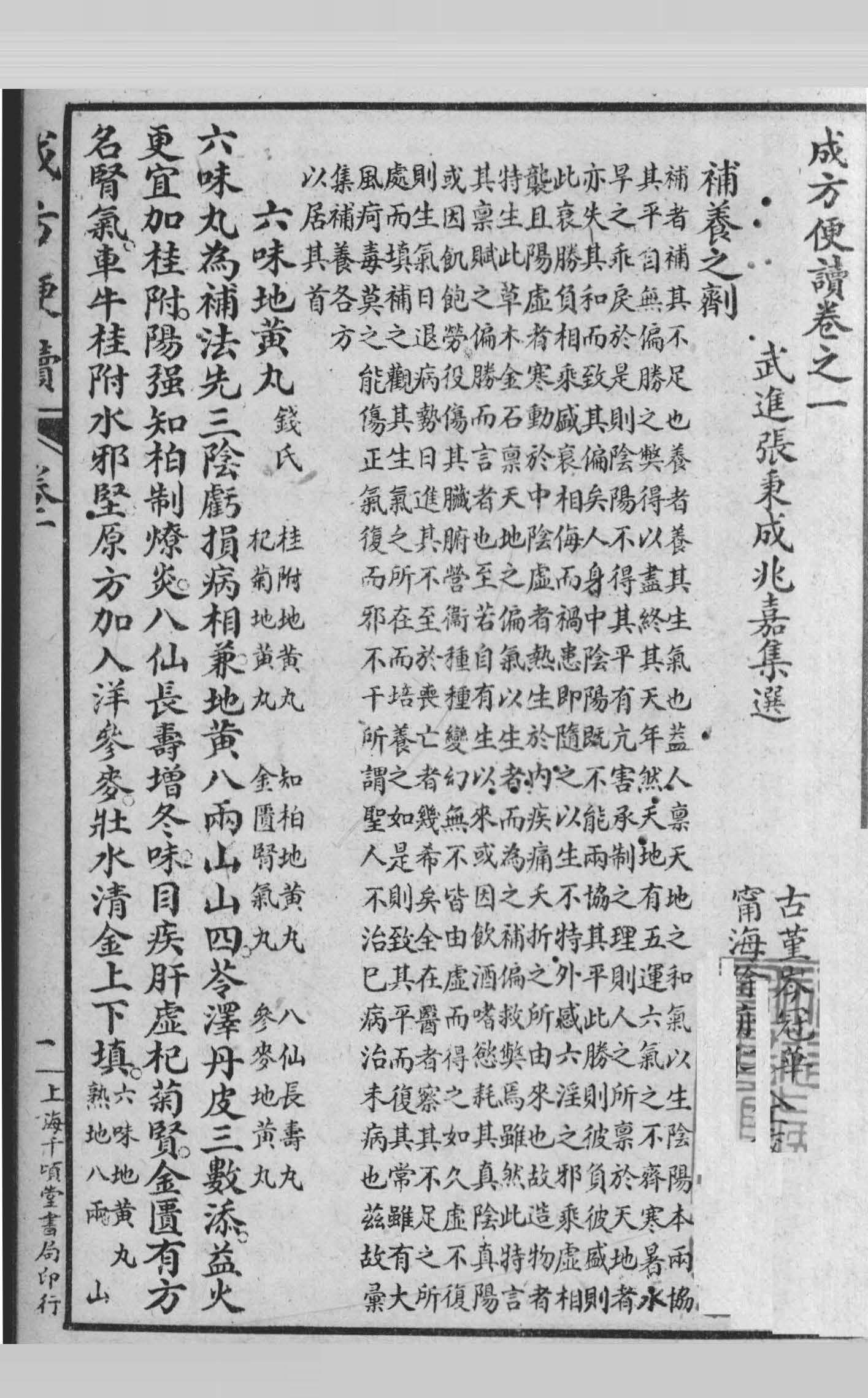 自近年有自詡伤寒专家者,执仲景书作号召,谓可概治世界之万病,其他先哲所著,一笔抹杀,竭宣传詬詈之力,以博蝇头尺寸之利,其徒更从而变本加厉,扶一人偏激之说以夸世,於是见病不识,治病不效,遇病即无把握,遂称中医為无用,乃剽窃西医皮毛,树改良之帜,以耸人耳目,呌嚚跳梁,以与中医界决斗而求名焉,一般青年,震其奇而慕其易,盲从附和,出主入奴,风气所趋,而中医之精义渐為所蔽矣,千顷堂主人有鉴於此,以為欲挽医界狂澜,非提倡中医常识不可,於是即刊先生之本草便读於前,复刊成方便读於后,俾有志医学者,由此两书入门,以求各家精深之学,庶中医治病之效力,可以维持不坠,盖亦今之有心人也,曩与秦君伯未谈及,秦君亦甚赞成,爰草数言,弁之卷首,世有确信中医而不為邪说所惑者,必深韙予言。——中华民国二十二年九月武进谢观利恒识於沪寓之澄齐