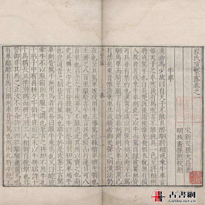 《程氏演繁露》又作《程氏演蕃露》或《演繁露》由宋代程大昌所撰笔记体著作,其名源自汉董仲舒《春秋繁露》。全书共分十六卷,后有《续演繁露》六卷,记载了三代(夏、商、周)至宋代的杂事笔记。此内含宋刊本(存十卷)及明嘉靖三十年程煦校刊本两种。