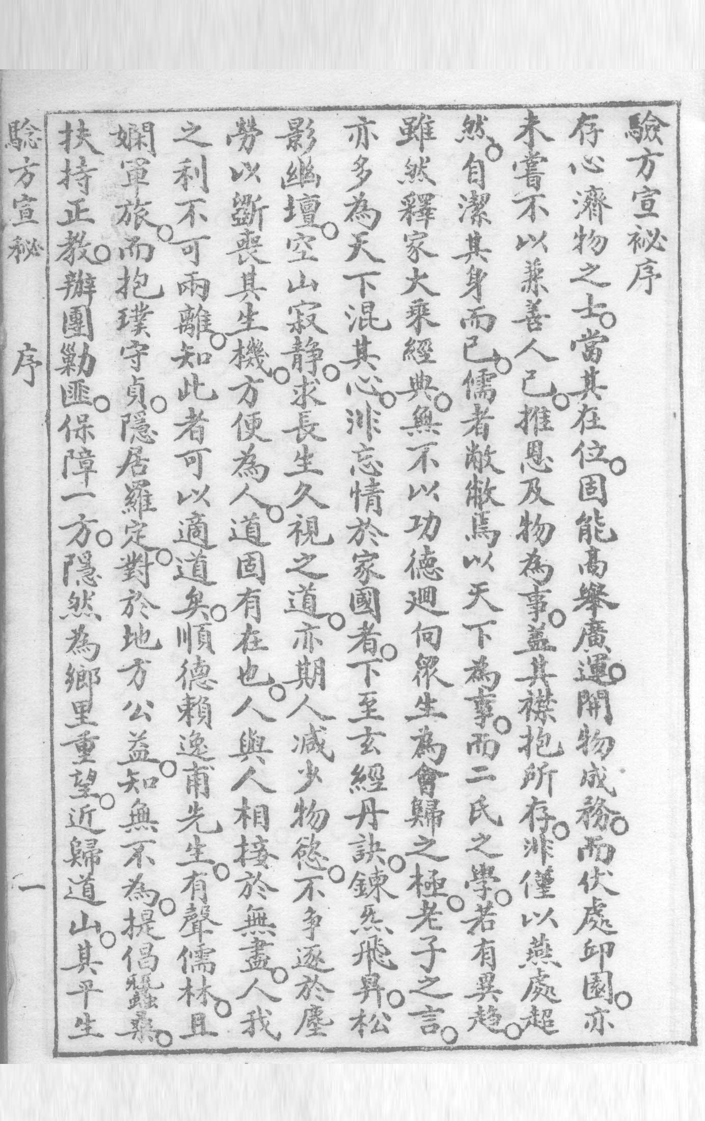 尝闻人之立身行己,居家处世,非有定识定力,难免不随流俗所转,予幼读家谱,获諦,始迁祖布衣公,尝语人以人生不必泥于仕宦為功业,凡有可以济人利物者,即皆功业云,予由是猛然觉悟而择是替非,凡值喫亏受屈之境,予以偿诸前生怨债而设想之,凡刀缴幸便宜之遇,于以他日循环所及而情虑之,矢积善自可光前裕后之志,而厌奋要利禄以扬名显亲之心,人之肴諛说以资谈柄,予则宣果报讲善书而适之,移弥月所浪费者為育婴放生之举,哀寿诞所虚糜者為矜孤恤寡之用,先消婚嫁之奢而多教读,力裁忌辰之宴以修坟塋,愤使臧获之所需以置边室,减捐赛会之资财而助账济,有学游艺之能宝学风水,有建花园之力务建宗祠,手泽先芬,校玩器而尤宝,寿文行状,当字画以益珍,矧予见人惟灾遘患,因病咨嗟,恨不得有以给其所求,而即脱其所苦,奈乎迷于流俗之徒,每每居奇医方以图射利,贫乏者力难满其所欲,虽求之甚殷,其终残忍漠视,甚矣,故作危言,询吓病者,勒券索谢,然乃用药,予见闻及此,輒等芒刺在身,又是奋心孤注,而搜牢居奇者所祕之著名验方,以期方便于世,而补官方之所未及,凡诸立法未纯,或他方出乎其右,或方虽应効,但其间微有流樊未臻尽美者,于皆宁缺毋滥,是恐虚延时日,怜之适以累之也,于自裳笔以谋菽水,樄檖数省,凡访闻及者,无不殚力购求,凡搜牢获者,无不广行传布,二十年间,征获内外验方二百余条,辑为二册,名曰验方宣秘,见之觉乎平淡无奇者,亦皆屡奏奇功,虽处万死一生之候,按法施治,无不起死回生,屡试屡验,欲付手民以公诸世,自惭殄殄未逮,故傍傍然以待将来,但而今而后,获此方者,视奇货可居,勿随流俗所转,惟愿遏人欲而循天理,去繁文以务实济,盖己能利济于人,天方利济于己,己如刻薄,天亦寡恩,定此识力而尽济人利物之心,未必不无少効焉。