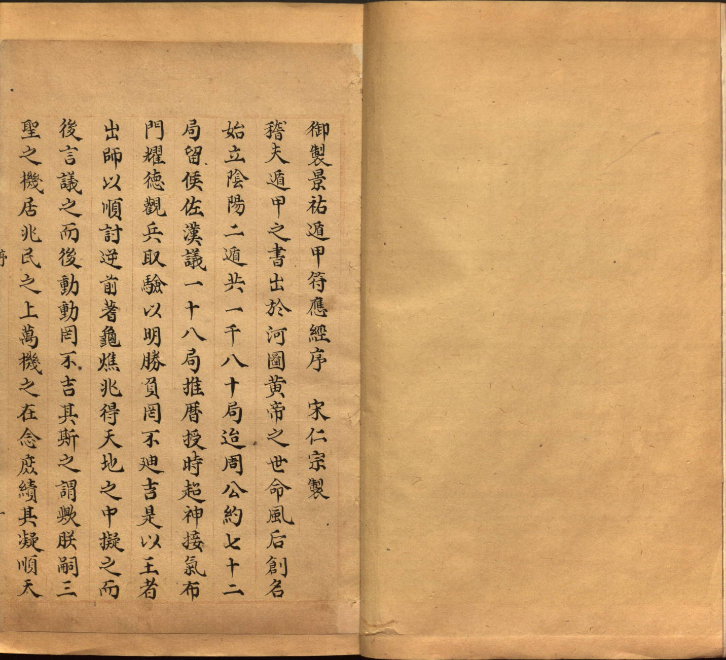 《景祐遁甲符应经》,被收录于子部珍本备要第192种,(宋)杨维德等撰,上下两部,共6卷,其主要内容以奇门遁甲论行军趋避之用、百事凶吉,书内正文正楷墨书,图符朱书。卷前有宋仁宗御制序,卷后有王巽序。此书为明末朱丝栏(织有红格的绢帛或画有红格的纸笺)钞本,内容丰富,极具收藏和研究价值。