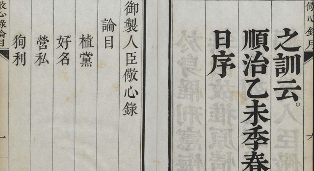 《御制人臣儆心录》是清顺治皇帝御撰。共八篇:植党论,好名论,营私论,徇利论,骄志论,作伪论,附势论,旷官论。大致概括了历代奸臣作恶不法的方方面面。书前有御制序。此本约刊行于清顺治12年(1655),此套本分为两册:汉文,满文本各一册。