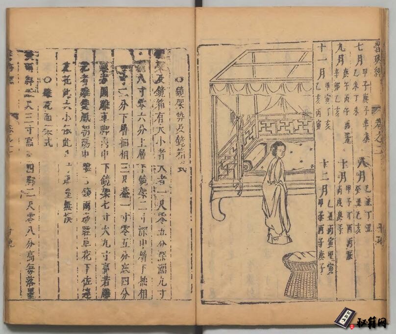 卷二全面介绍了建筑、畜栏、家具、日用器物的做法和尺寸,内容详实,亦为前文后图。