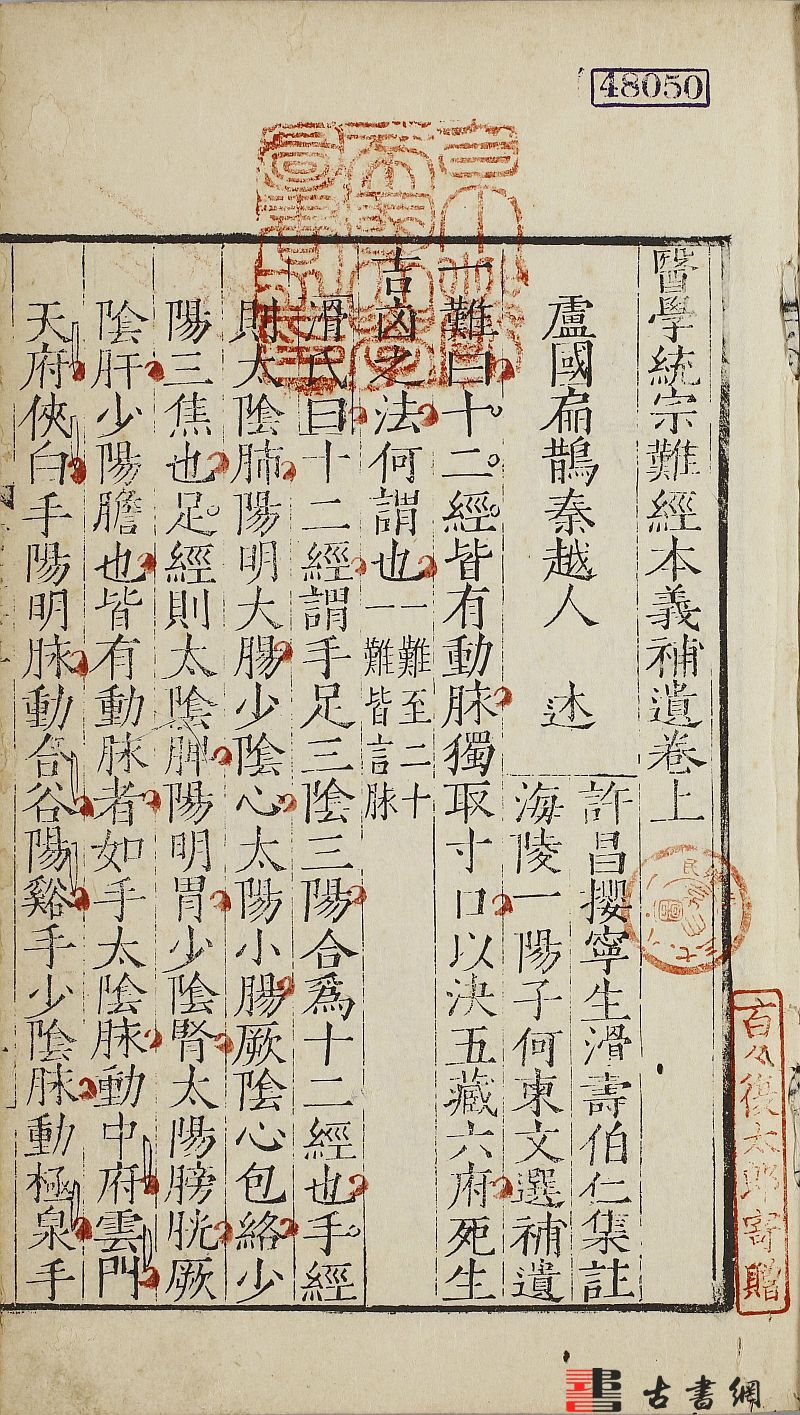 此《医学统宗》是由明代何柬编辑的一套综合性医书。全部共五册,包含:难经本义补遗(二卷)、治病针法、滑氏诊家枢要、医书大略统体、滑氏伯仁卮言、附杂录、试论。此为京都大学附属图书馆藏明隆庆三年刊本,国内稀见。