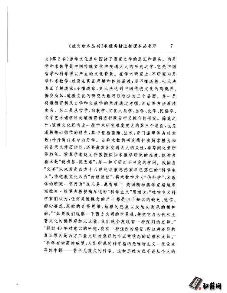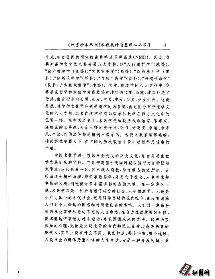 《书经》尝有国之大事,必谋及卿士,谋及庶人,断之龟筮之 说,是龟筮亦古之一大决策之学,今殷墟发掘大量甲骨文卜辞足 以为证。《周礼》有大卜之职官,掌卜筮以稽疑,虽三王不同龟, 四夷各异卜,然各以决吉凶。道家之学本出于史官,据《礼记• 月令》,天子于立冬之月,“命太史衅龟莢,占兆,审卦吉凶”。古 时太史有如后世之辅相,有燮理阴阳、交通天人之职责,故必精 通卜筮之学。而后龟筮决策之术,由象卜而数卜,由龟而筮,由 《连山》、《归藏》、《周易》而八卦象数,而梦占,而太乙九宫,而六 壬遁甲,而看相推命,遂成一博大精深之中国术数学。要之,术 数学亦史官之学,为中华道学文化的一大支柱。