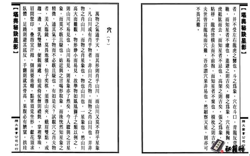 方之座,山有金木水火土之分,观弯环勾折之势,即摆舞动摇之态,断而复续,过峡何疑,东而覆展,胎息可见,团盖如防水劫,张弓似畏风吹,星余玉辰,山连流退而水止,星横艰漠,山能波海而穿江。星之有名者,三百八十三座,共一千四百六十四星,其微而无名者,尚有一万二千五百二十漏。山之辑撒者五,裤洞天者三十六,裤福地者七十二,有名者五千三百七十,其无名者,不知几千万亿兆焉,至於沃野平畴皆分星体,澄源巨港亦秉星形,平阡则力更厚於高峰,水神则秀加灵於山气,是编也语无锦囊,岂聘吾之娇说哉?意绝雷同,亦欲言所独得耳?无论大局大坦,始符星象,即或一勾一搭:亦类星形,倘少变化之方,必致误用之弊,惟愿知音哲匠,嗤为了不异人,不求玄术俗巫,亦欲强作解事,靖据言辞之所及,可明意旨之所归,世或斥为迁谈,君姑勉为妄听