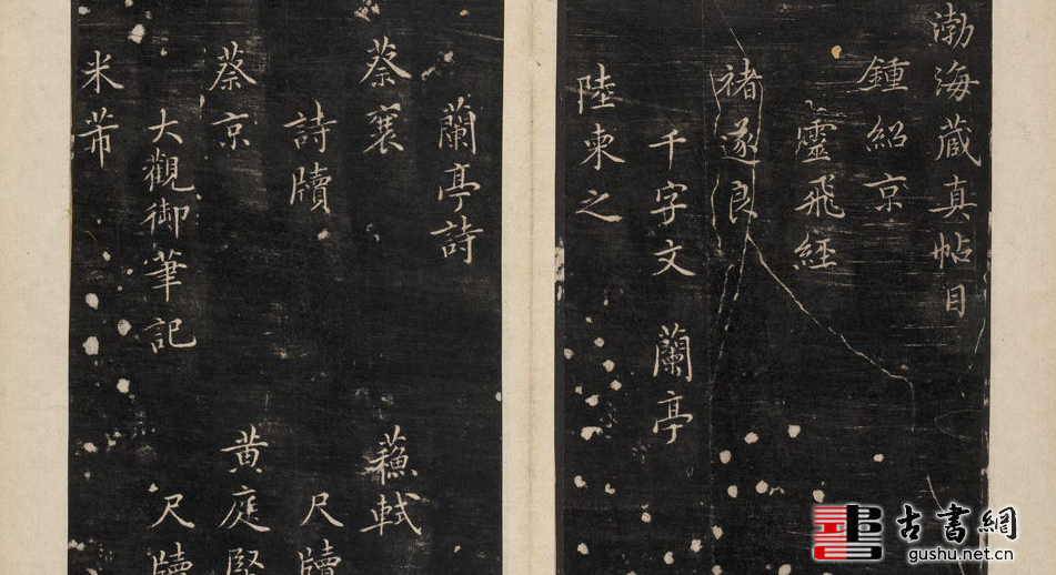第一册为唐钟绍京“灵飞经”,因是小楷,镌刻难度很大,因此最有名,且“斋室”二字未损。第二册为褚遂良小楷《千字文》和临王右军《兰亭序》,这是个特殊版本“兰亭”。后有米芾、米有仁、范仲淹题跋。第三册有蔡襄、苏轼书法。第四册有蔡京书法“大观御笔记”,黄庭坚书法,米芾“櫹间堂记”。第五册为赵文 敏临王羲之“黄庭内景经”,“乐毅论”和右军三帖。第七册为赵孟頫《真草千字文》。第八册为赵孟頫“再和杨公济梅花十绝”和尺牍。此本少量页面有残损。