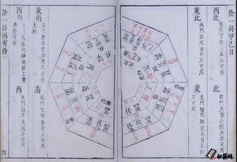 没有分门介绍,而是按照方位旁边标注诸如“伤门日奇,讨债吉”“生门腾蛇,修造不吉”等等,