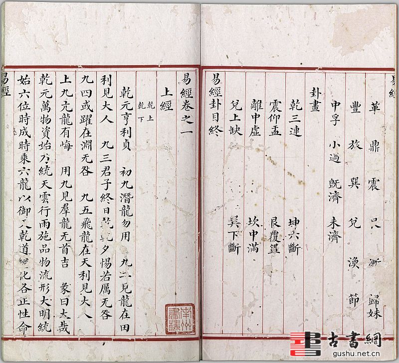 《周易》也称《易》《易经》,本是古代占卜之书,包括《经》和《传》两部分。《经》文叙述了六十四卦三百八十四爻。《传》为解释卦名、卦义、卦辞、爻辞的七种十篇,称为“十翼”“《易传》”“《易大传》”。八卦和六十四卦的出现当在西周以前的远古年代,有学者认为《经》的编订在商末周初,《传》作于春秋战国,非一人一时之作。古人认为经伏羲、周文王、周公、孔子等历代圣人编定而成。内容广泛记录了西周社会各方面,包含史料价值、思想价值和文学价值。其外层神秘,而内蕴的哲理至深至弘。“诗经”首叶上方钤有“文源閣寶”朱文大方印。案此乃清内府朱丝栏精写本,文源阁之劫余,至可宝也。