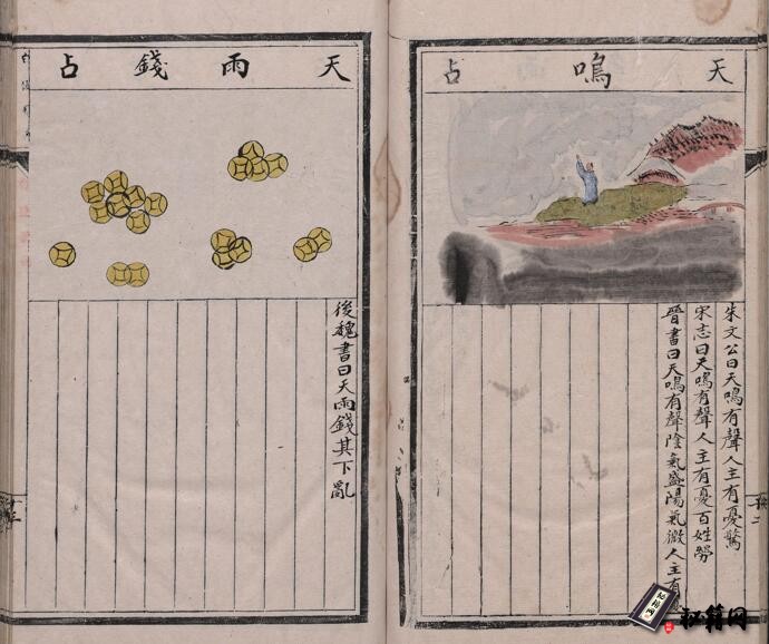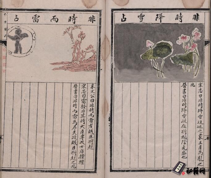 台湾省国立图书馆藏 手绘彩抄本《白猿图说》也称《白猿占经》或《白猿风雨图》共12卷(子-亥),其内容为以图为主的占候类著作。 据传乃诸葛亮所著,12卷896页全,疑是天书,书中专著风雨雷电霪晦明之兆、未附之日月星云图,殆好事者於,晦涩难懂!