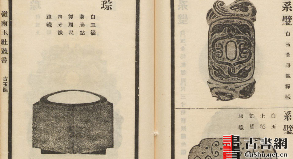 此《岭南玉社丛书》第一集分为上下册。上册含:黎无暇序、玉纪(陈原心著)、玉纪补(刘心宝著)、玉纪正误(李凤廷著)、玩古(徐寿基著)、古玉器(陈元龙著);下册含:古玉所见录、古玉图。此为民国14年(1925)广州岭南玉社编辑出版。