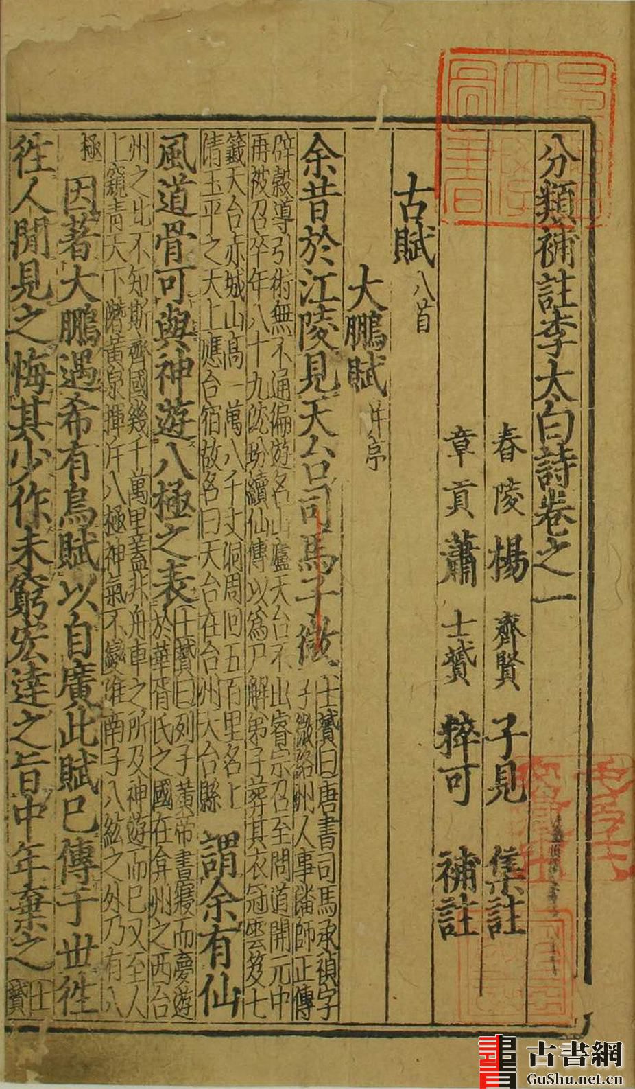 此《分类补注李太白诗》为唐李白撰,宋杨齐贤集注,元萧士赟补注。全书共二十五卷,包含古赋、古风、乐府、歌吟、赠寄、送、酬答等题材。此内含元至大勤有书堂刊本、明正德安正书堂刊本、明嘉靖吴会郭云鹏编刊本、明万历长洲许自昌校刊本。