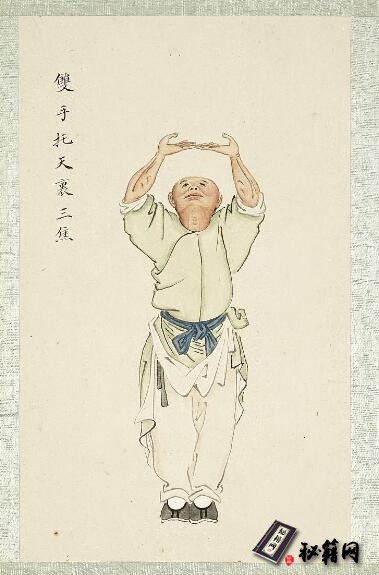 八段锦与太极拳均为中国民间广为流传的健身法,由八种功法集锦组成,内容包括肢体运动和气息调理,姿势分站、坐两种,站式要求双脚与肩同宽,坐式要求盘膝正坐,配合舌抵上颚、意守丹田等细节,每种动作反复多次。此台北故宫博物院藏清宫绘本站式《八段锦册》内含彩绘插图十幅,描绘的是站式八段锦的动作要领。