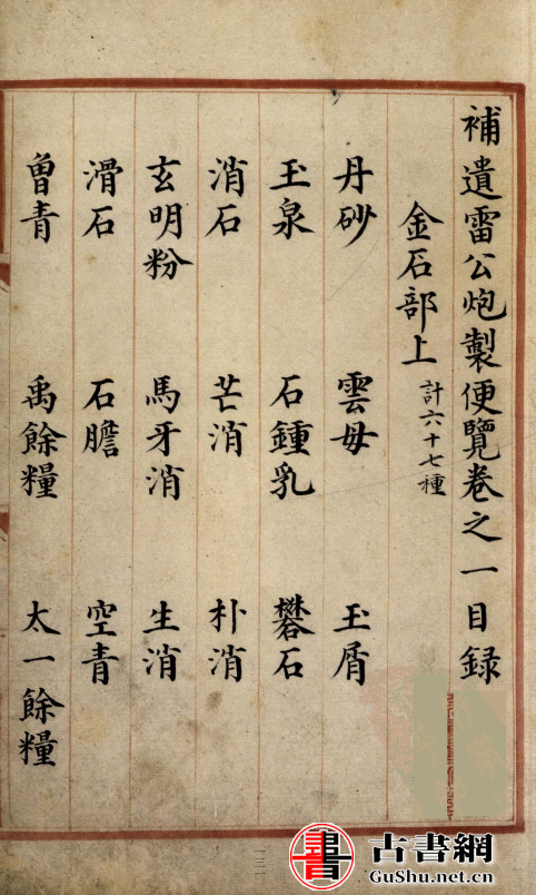 《补遗雷公炮制便览》的文字内容属于综合性本草,涉及的炮制内容系出南北朝雷斆《雷公炮炙论》。至明代,雷斆常被误认为传说中的黄帝时臣雷公,以“雷公”为名的本草书或者药性赋甚多,《新刊雷公炮制便览》即为其一。