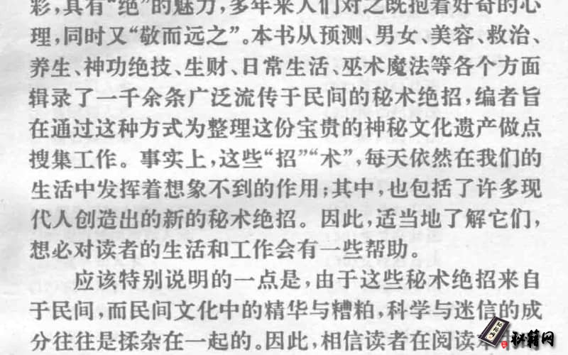 应该特别说明的一点是,由于这些秘术绝招来自 干民间,而民间文化中的精华与糟粕,科学与迷信的成 分往往是揉杂在一起的。因此,相信读者在阅读本书时 有足够的鉴别力能识别它们,取其精华,去其糟粕。