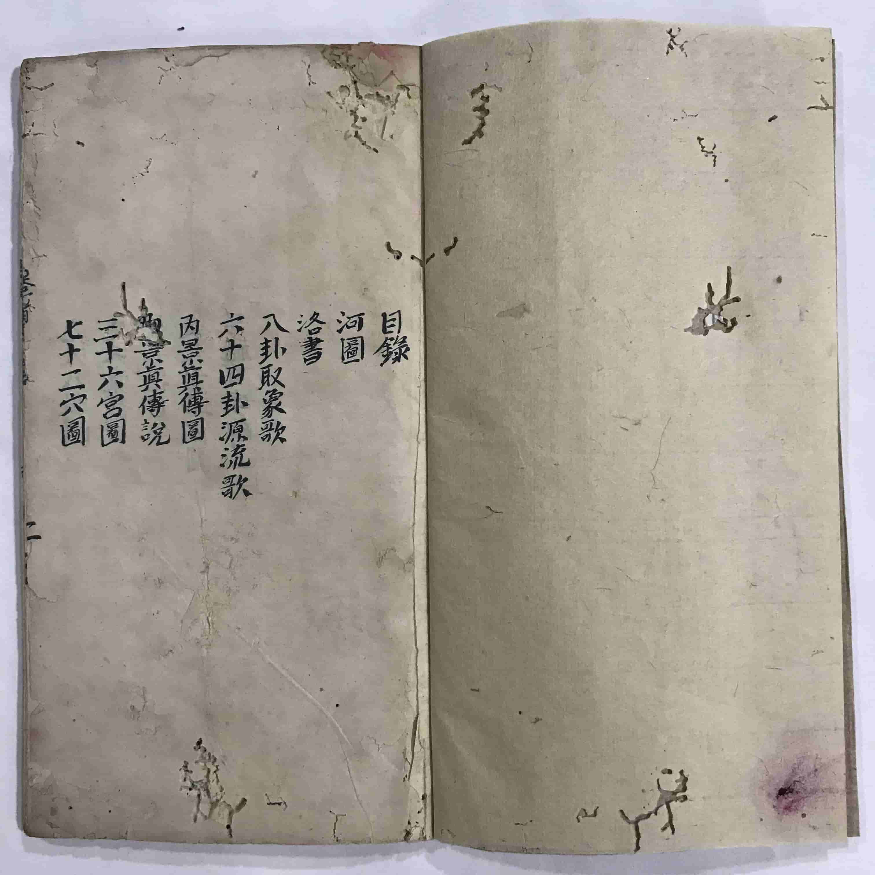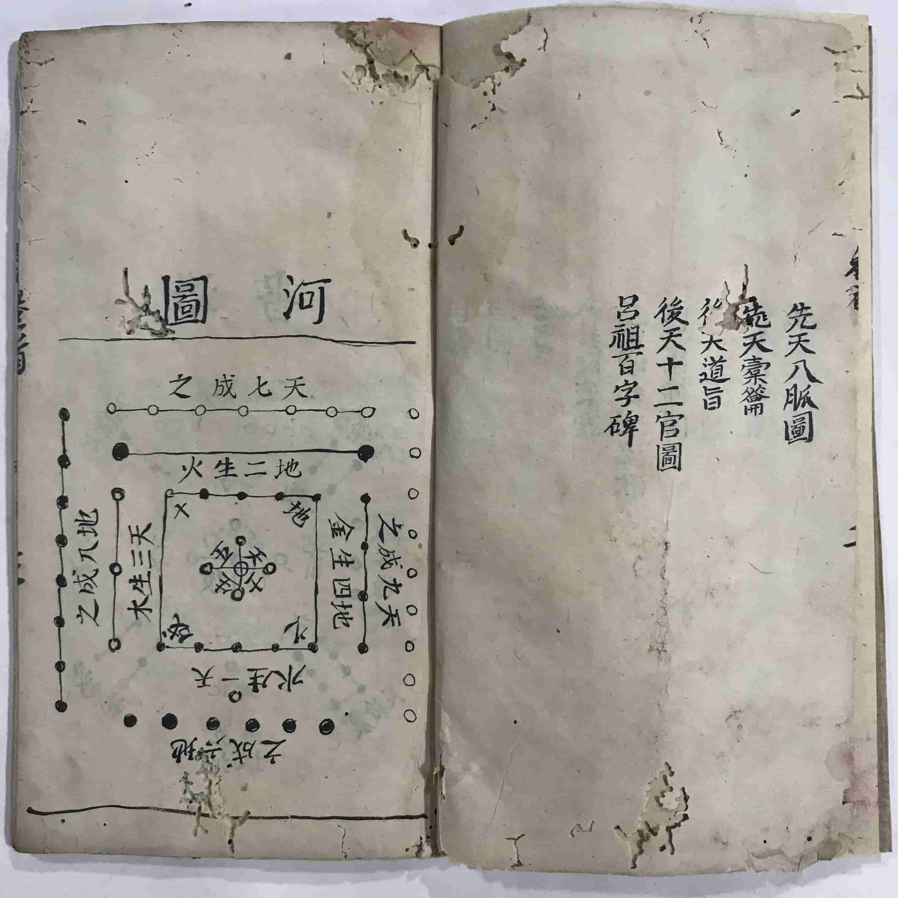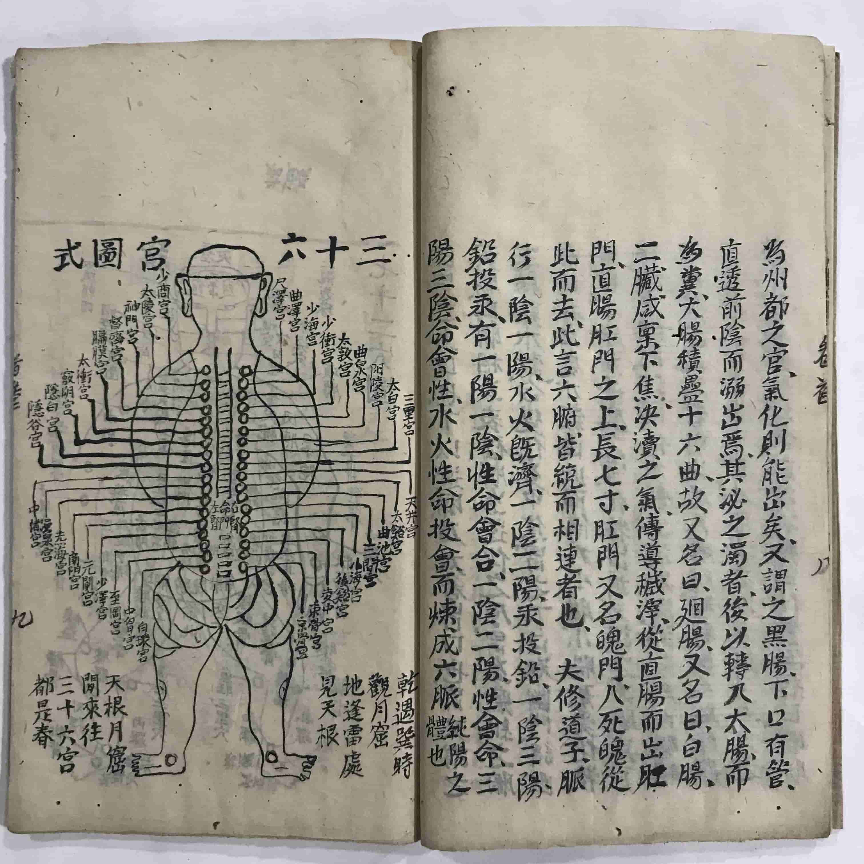 《道医学抄本》,全本共38个双面,合计76页。内容包含:河图、洛书、八卦取象歌、六十四卦源流歌、内景真传图、内景真传说、三十六宫图、七十二穴图、先天八卦图、先天槖篇、后天道旨、后天十二官图、吕祖百字碑、奇经八脉图等。
