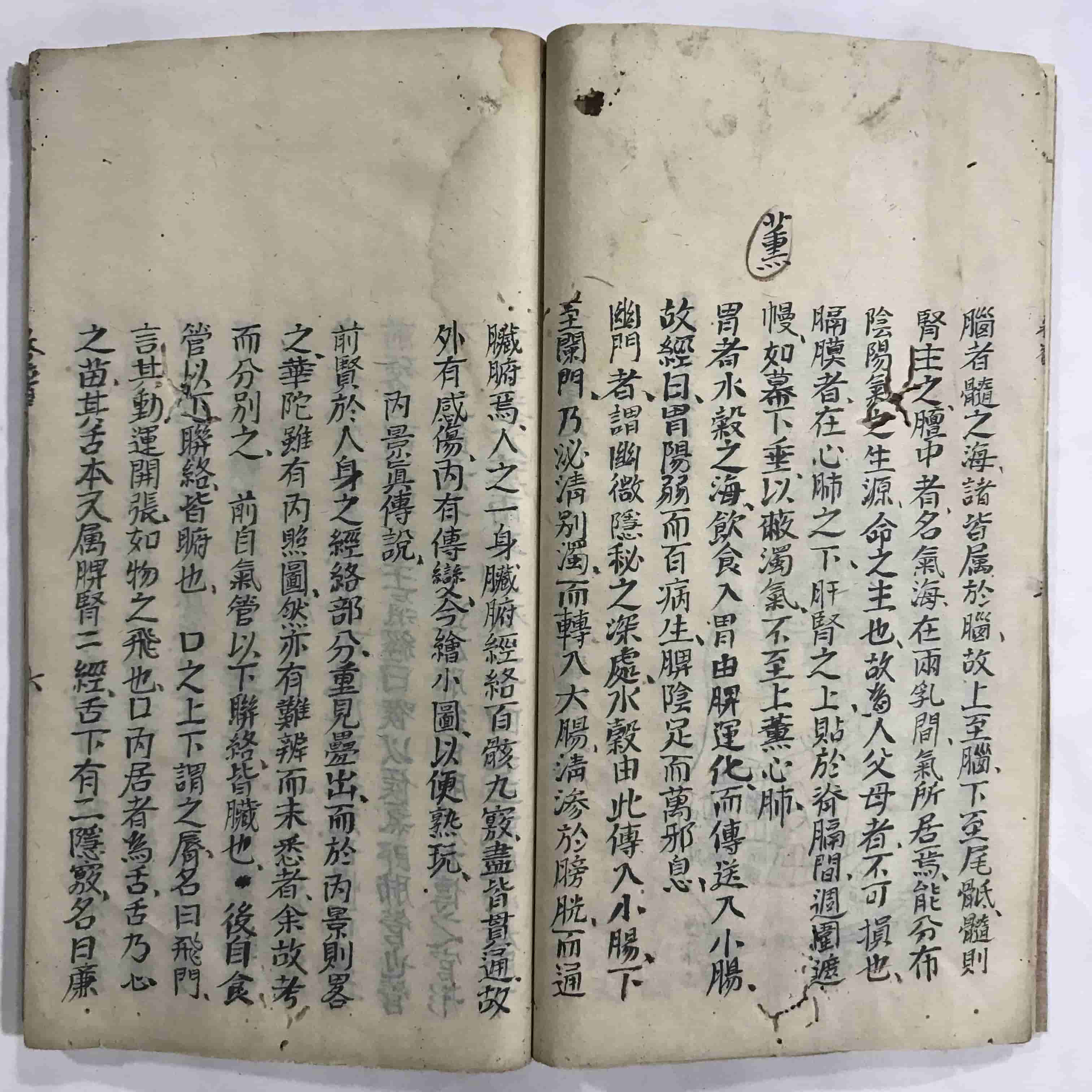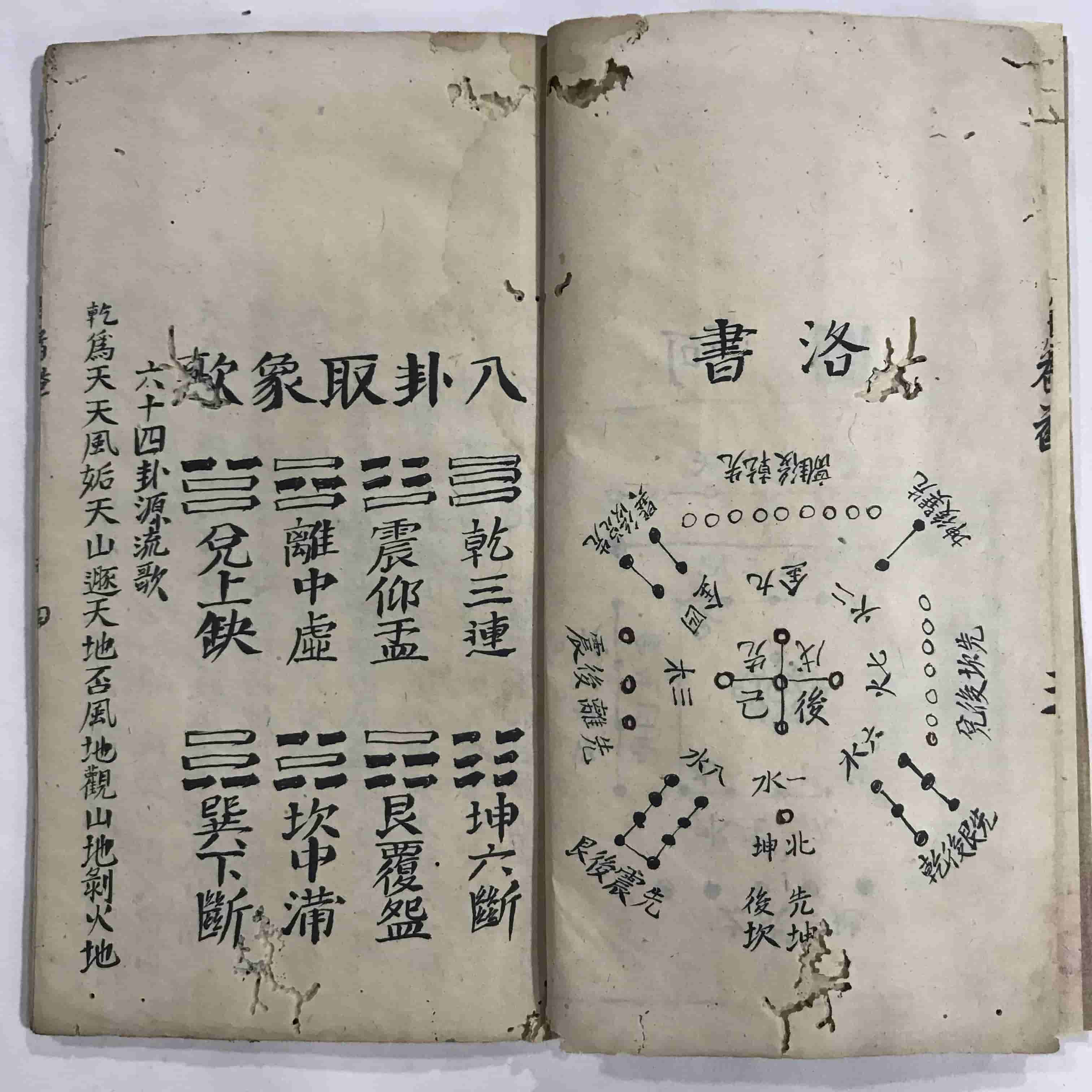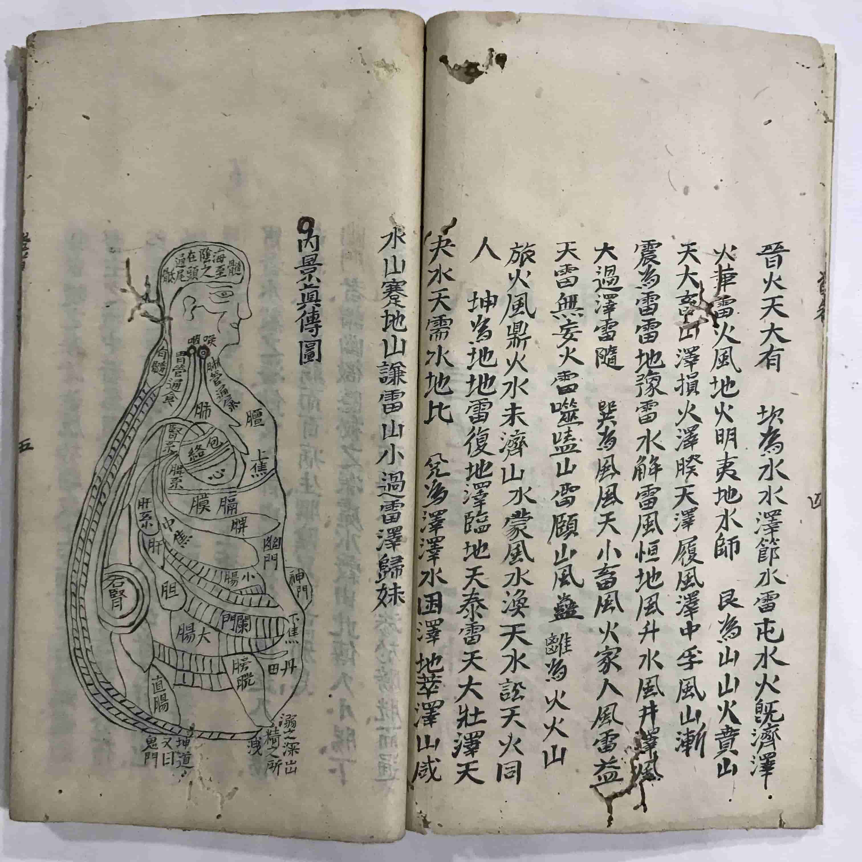 《道医学抄本》,全本共38个双面,合计76页。内容包含:河图、洛书、八卦取象歌、六十四卦源流歌、内景真传图、内景真传说、三十六宫图、七十二穴图、先天八卦图、先天槖篇、后天道旨、后天十二官图、吕祖百字碑、奇经八脉图等。