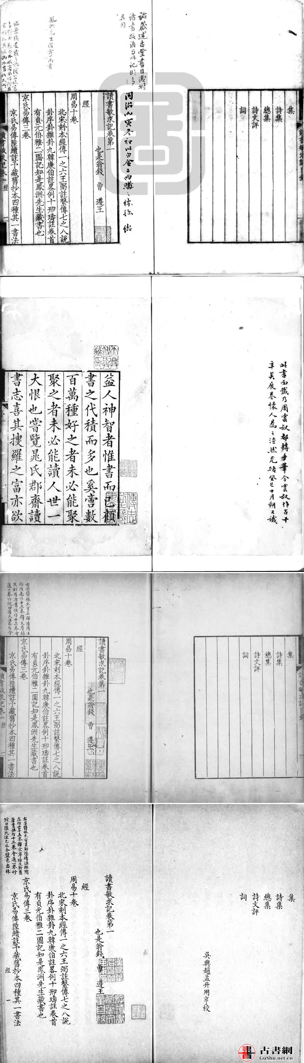 经部分:礼乐、字学、韵书、书、数、小学等6类史部分:时令、器用、食 经、种 艺、豢养、传记、谱牒、科第、地理舆图、别志等10类子部分:杂家、农家、兵家、天文、五行、六壬、太乙、奇门、历法、卜筮、星命、相法、宅经、葬书、医家、针灸、本草方书、伤寒、摄生 、艺 术、类家等21类集部分:诗集、总集、诗文评、词等4类。总计著录图书634种。著录各书均标注卷帙完阙,作者名氏,或述授受源流,或记考证评论;对于一书缮写刊刻之工拙,版本优劣之辨别论述较多。《读书敏求记》成书之后,仅有抄本流传。钱曾逝世后,吴兴赵孟升于雍正四年(1726)雕版印行。后又有乾隆十年(1745)嘉兴沈尚杰刻本、道光五年(1825)仪征阮福小琅嬛仙馆刻本,及番禺潘仕成刻《海山仙馆丛书》本、1926年长洲章钰刊印校证本等。钱曾 (1629年~1701年),字遵王,号也是翁,又号贯花道人、述古主人。虞山(今江苏常熟)人。父亲钱裔肃和族曾祖钱谦益(见绛云楼)都是藏书家,受其影响,钱曾年轻时即有志于收藏古籍,访求图书不遗余力。他入清后便无意仕途,顺治十八年(1661年)在江南奏销案中因欠赋被革去生员。他继承了其父的藏书,后来又得到了钱谦益的绛云楼焚余之书,使藏书聚至4100余种,其中有很多宋元刻本和精抄本,成为继钱谦益绛云楼和毛晋汲古阁之后的江南藏书名家。晚年和钱谦益有隙,钱谦益去世后不久,他和柳如是的部分藏书,亦被其收去,柳如是因此而被逼自缢。钱曾的藏书室先后命名为述古堂和也是园。他重视宋元刻本及旧抄本,并认真校书,为古籍存真起了一定的作用。他先后藏书达30余年,自称“食不重味,衣无完彩,摒当家资,悉以藏书”。他还与当时的毛晋、毛扆父子,陆贻典,季振宜,冯舒,冯班兄弟,叶奕,顾湄等藏书家互通有无,易书抄校,从而使一些珍本秘籍得以流传。最喜宋版古籍,藏书近5 000种,数十万卷。建书楼“述古堂”,另有“也是园”、“莪匪楼”。与江浙各藏书家如曹溶、金俊明、叶树廉、冯舒、毛扆、陆贻典等人,借抄图书。钱氏抄书以其纸墨精良、校勘仔细而著称,世称“钱抄”,与毛晋抄本媲美。他去世后,藏书大部分归于泰兴季振宜。其藏书印有“彭城世家”、“述古堂藏书记”、“虞山钱曾遵王藏书”、“钱遵王藏书”、“莪匪楼藏书”、“钱遵王述古堂藏书”、“克庵”、“传家一卷帝王书”、“篯后人”等印。子钱沅,字楚殷,继承藏书,有藏书印为“传家一卷帝王书”等。