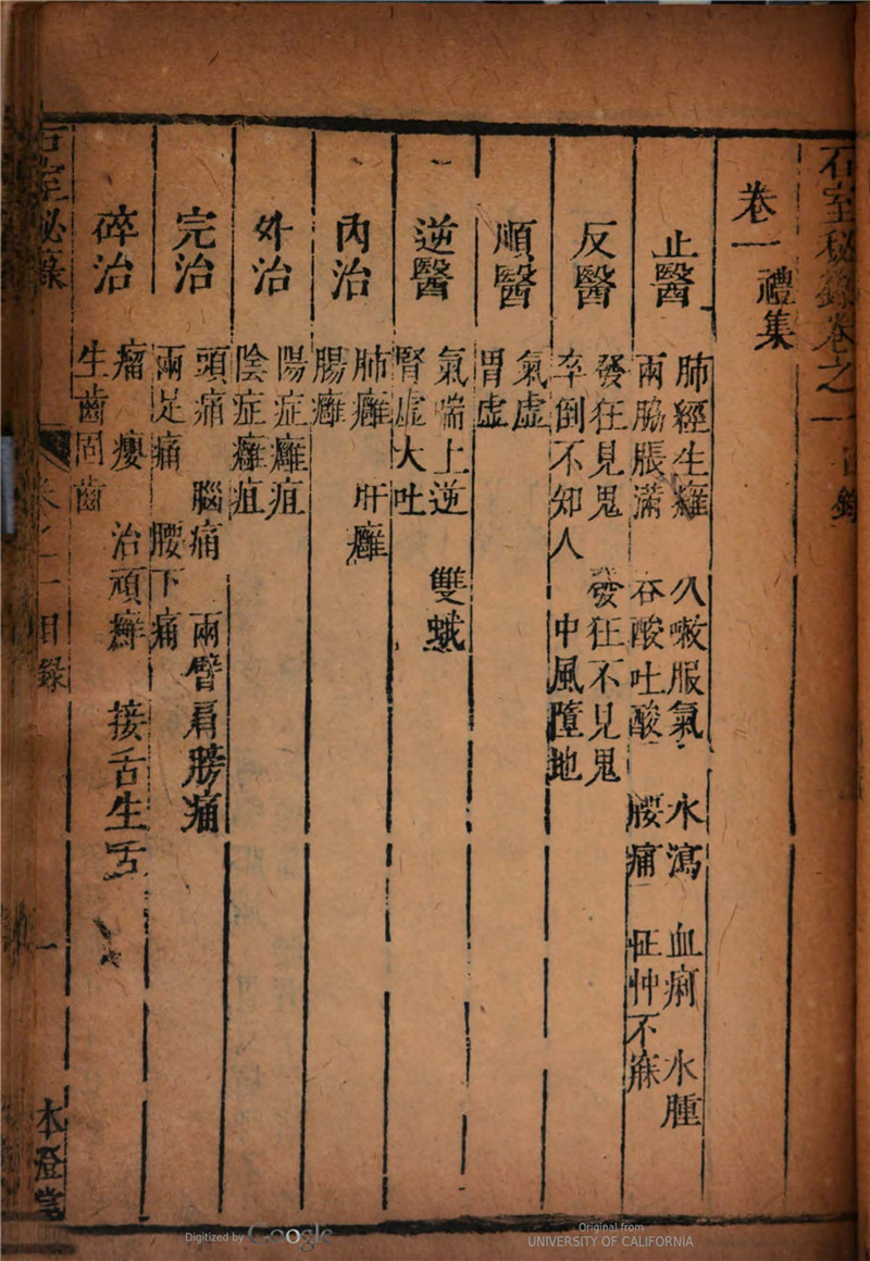 《石室秘录》是中医古籍中唯一一部以治法为主要内容和标目的著作。全书分6卷,依次分为礼、乐、射、御、书、数六集,各集之中以治法为目。其中,礼集中载14种治法,乐集载30种治法,射集中载39种治法,御集中载33种治法,书集中载12种治法和17论,数集中载有7大类疾病(7门)和16种杂病。全书论述总计128法、17论、7门、16杂病,内容闸述了内、外、妇、儿、五官等100种左右疾病的证治,收古今成方及作者自定方500余首,其中大多处方为白裁,是中医古籍中理论联系实际、理法方药俱备的治法专著。