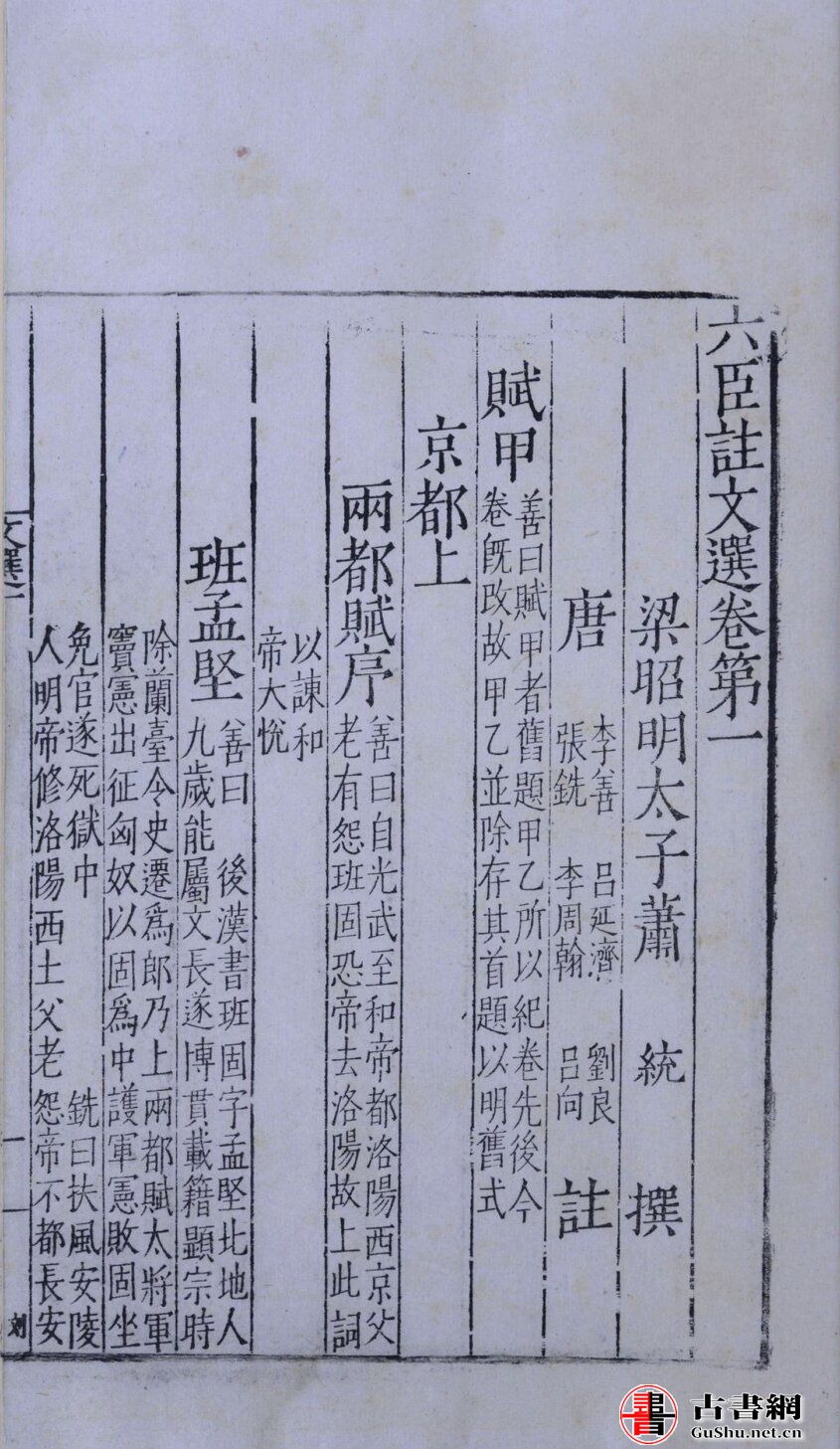 六臣为:唐五臣(吕延济、刘良、张铣、吕向、李周翰)及李善。