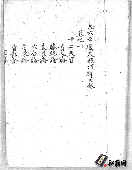 《大六壬通天银河棹》,目录: 卷之一十二天官卷之二十二神将卷之三天地章总断第一,仕宦章总断第二卷之四科名章总断第三,身命章总断第四卷之五家宅章总断第五,婚姻章总断第六,胎产章总断第七卷之六宴会章总断第八,图谋章总断第九,谒贵章总断第十,求财章总断第十一卷之七假借章总断第十二,商贾章总断第十三,出行章总断第十四,行人章总断第十五,田禾章总断第十六卷之八蚕桑章总断第十七,博弈章总断第十八,渔猎章总断第十九,人力章总断第二十,六畜章总断第二十一,病祟章总断第二十二。