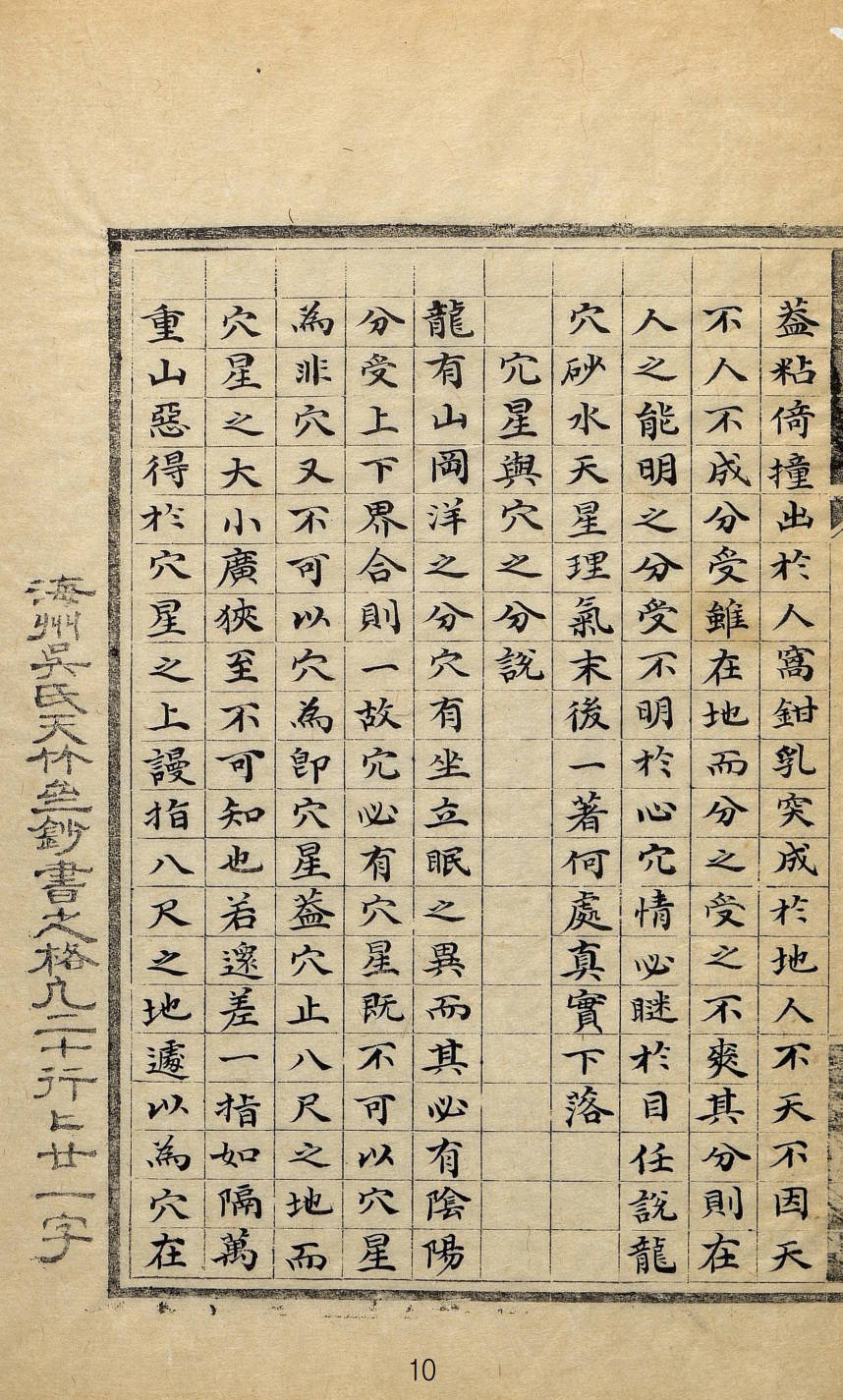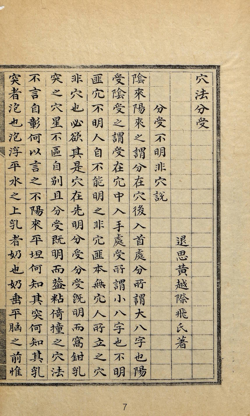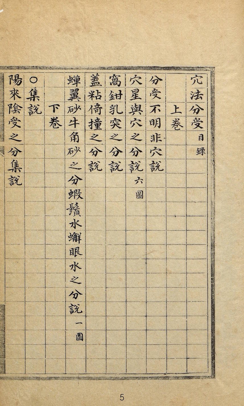 《穴法分受》,康熙六十年(1721),(淸)黄越著,2卷1册全。内容包含,上卷:分受不明非穴说,穴星与穴之分说,窝钳乳突之分说,盖粘倚撞之分说,蝉翼砂牛角砂之分缎鬟水游眼水之分说。下卷:阳来阴受之分集说,阴来阳受之分集说,水法必用天玉经说,恋头水法并重说。