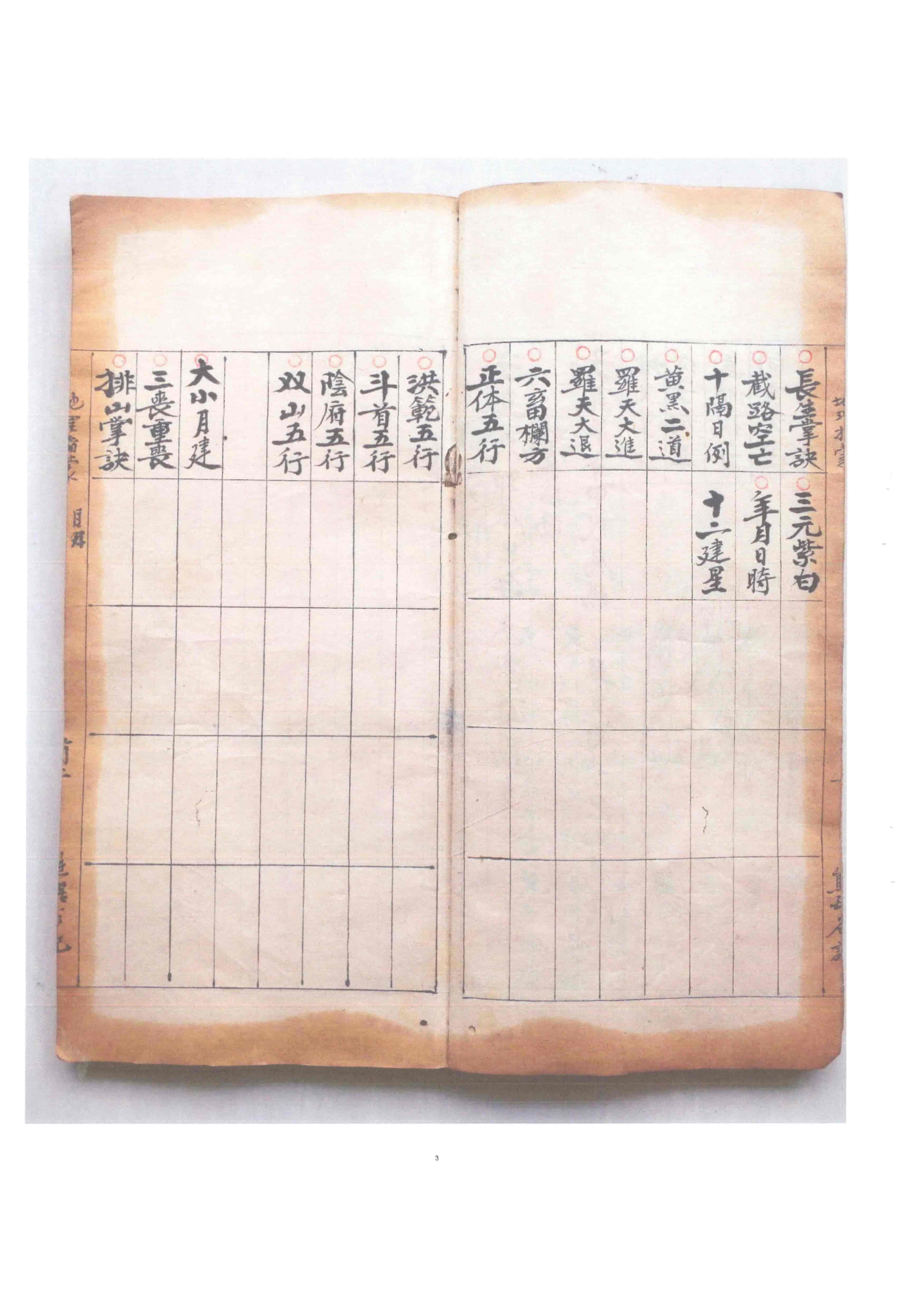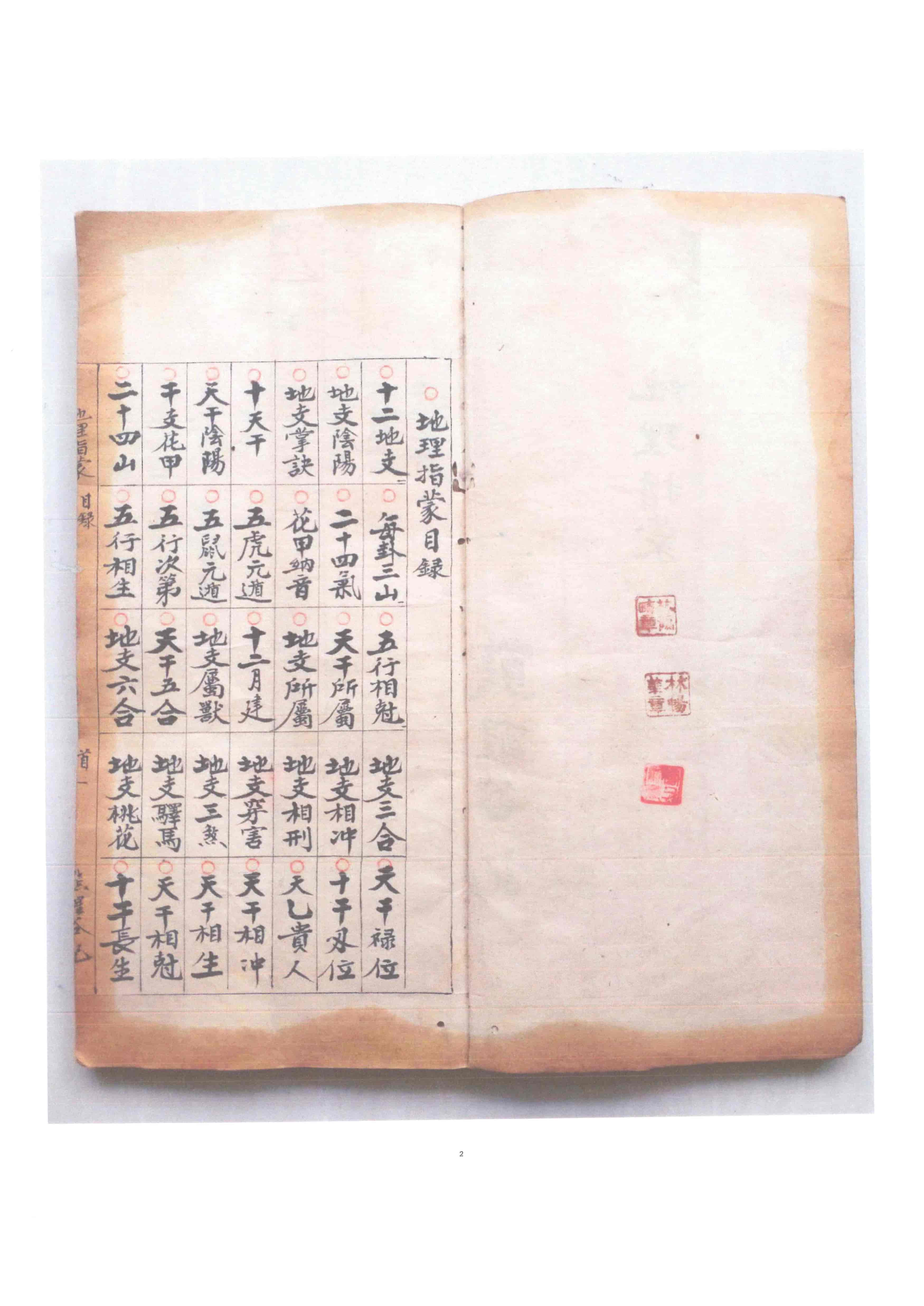 《地理指蒙》目录:十二地支,地支阴阳,地支掌诀,十天干,天干阴阳,干支花甲,二十四山,每卦三山,二十四气,花甲纳音,五虎元遁,五鼠元遁,五行次第,五行相生,五行相尅,天干所属,地支所属,十二月建,地支属兽,天干五合,地支六合,地支三合,地支相冲,地支相刑,地支穿害,地支三煞,地支驿马,地支桃花,天干禄位,十干刃位,天乙贵人,天干相冲,天干相生,天干相尅,十干长生,长生掌诀,截路空亡,十隔日例,黄黑二道,罗天大进,罗天大退,六畜栏方,正体五行,洪范五行,斗首五行,阴府五行,双山五行,大小月建,三丧重丧,排山掌诀,三元紫白,年月日时,十二月建。